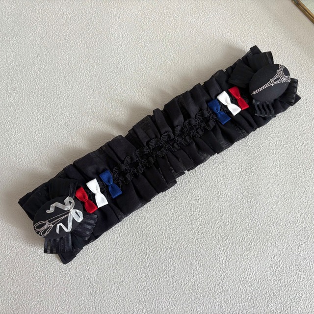 parisienne ヘッドドレス 憧れのパリをテーマにしたヘッドドレスです。 エッフェル塔とバレエシューズの刺繍と小さなリボンを飾ってキュートなヘッドドレスを作りました。 黒はトリコロール、生成りはアンティークな雰囲気を目指した配色です。 ヘッドドレス本体はコットンのオーガンジーにたっぷりギャザーを寄せ、さらっと軽やかな質感のフリルに仕立てました。 生地と同色のグログランのようなうねうねしたブレードを飾り、3つのリボンの存在を引き立たせています。 全体が軽く、控えめなサイズ感のため、ヘアアレンジで遊んでいただいても楽しいかと思います。 両サイドのリボンはブローチピンでつけ外しが可能です。 (付け外しの際は生地やレースのひっかけに十分ご注意ください) クリップ式のためつけやすく、ヘアスタイルを選ばずつけていただけるヘッドドレスとなっています。 *刺繍はいつも以上に個体差があります。 通販ではお選びいただけませんが(角度や写真の映り方などで雰囲気が変わり正確な管理が難しいため)、それぞれの個性としてお楽しみいただけますと幸いです。 ○サイズ○ 本体:長さ 約30㎝ 幅(フリル込み)約7cm ○ご購入にあたっての注意○ お使いのモニターや閲覧環境により、写真と実物の色味や質感などが多少異なって見えることがございます。 丁寧な制作を心がけていますが、ハンドメイド品となるため、若干の個体差が出ることがありますことをご了承ください。