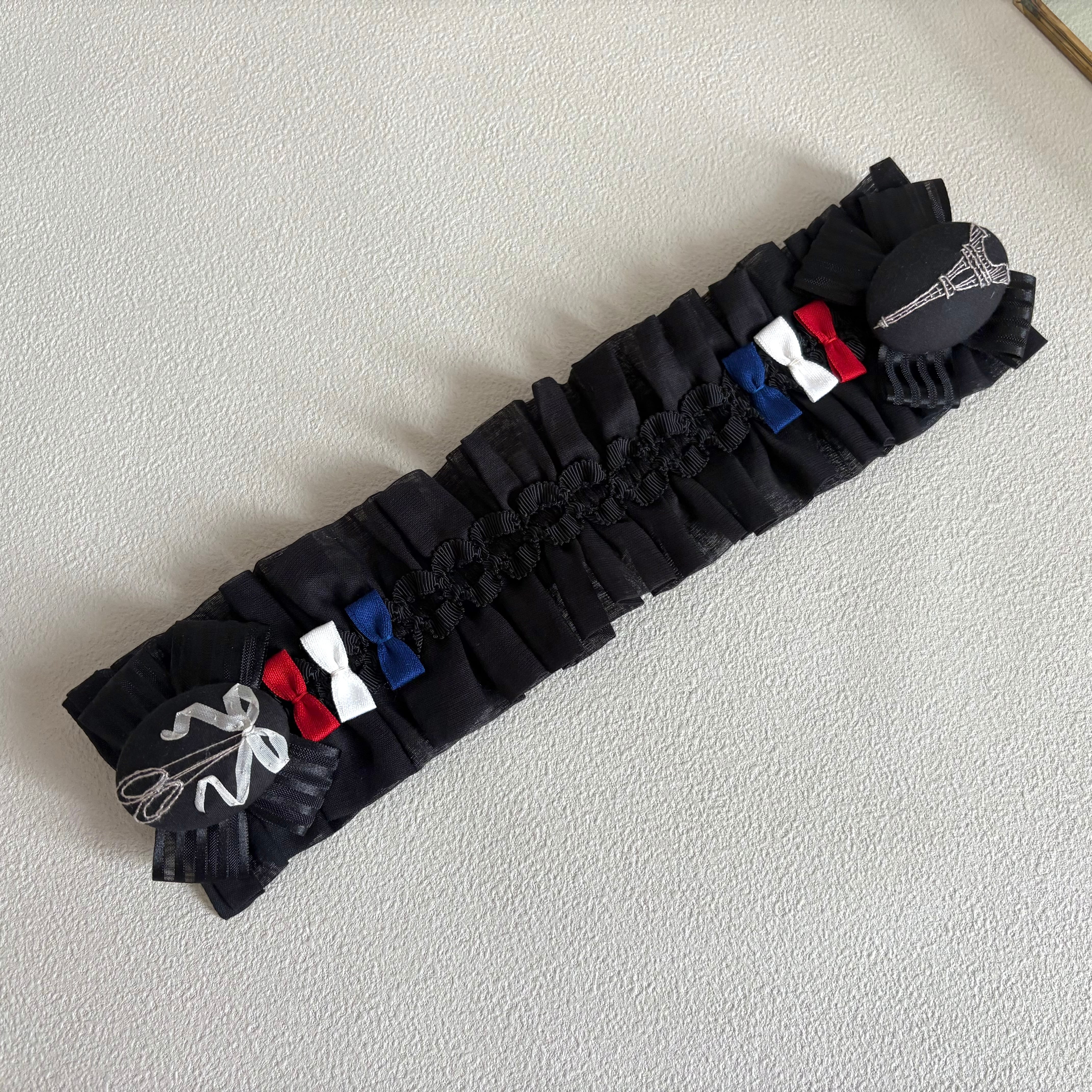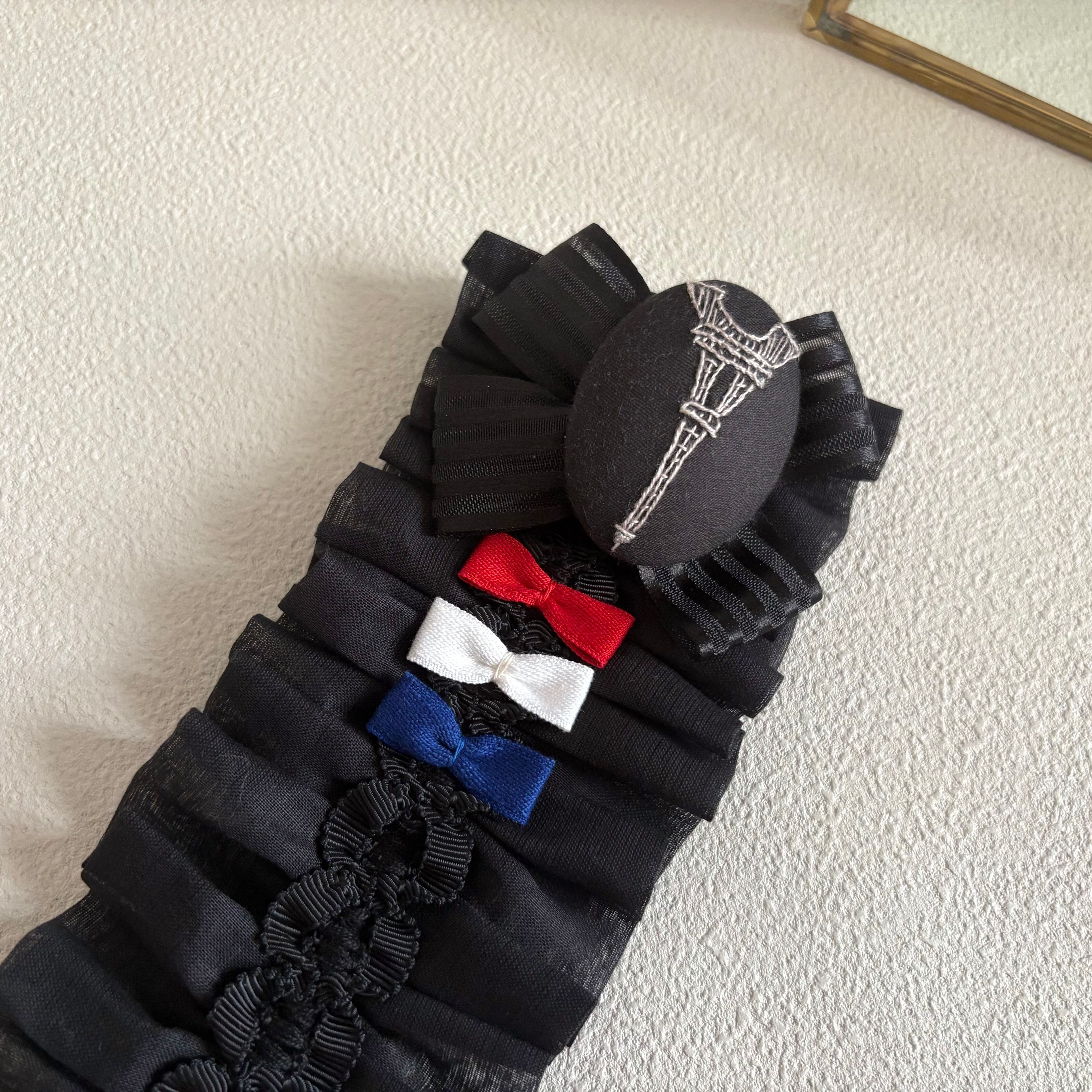 エッフェル塔とバレエシューズの刺繍と小さなリボンを飾ってキュートなヘッドドレスを作りました。
