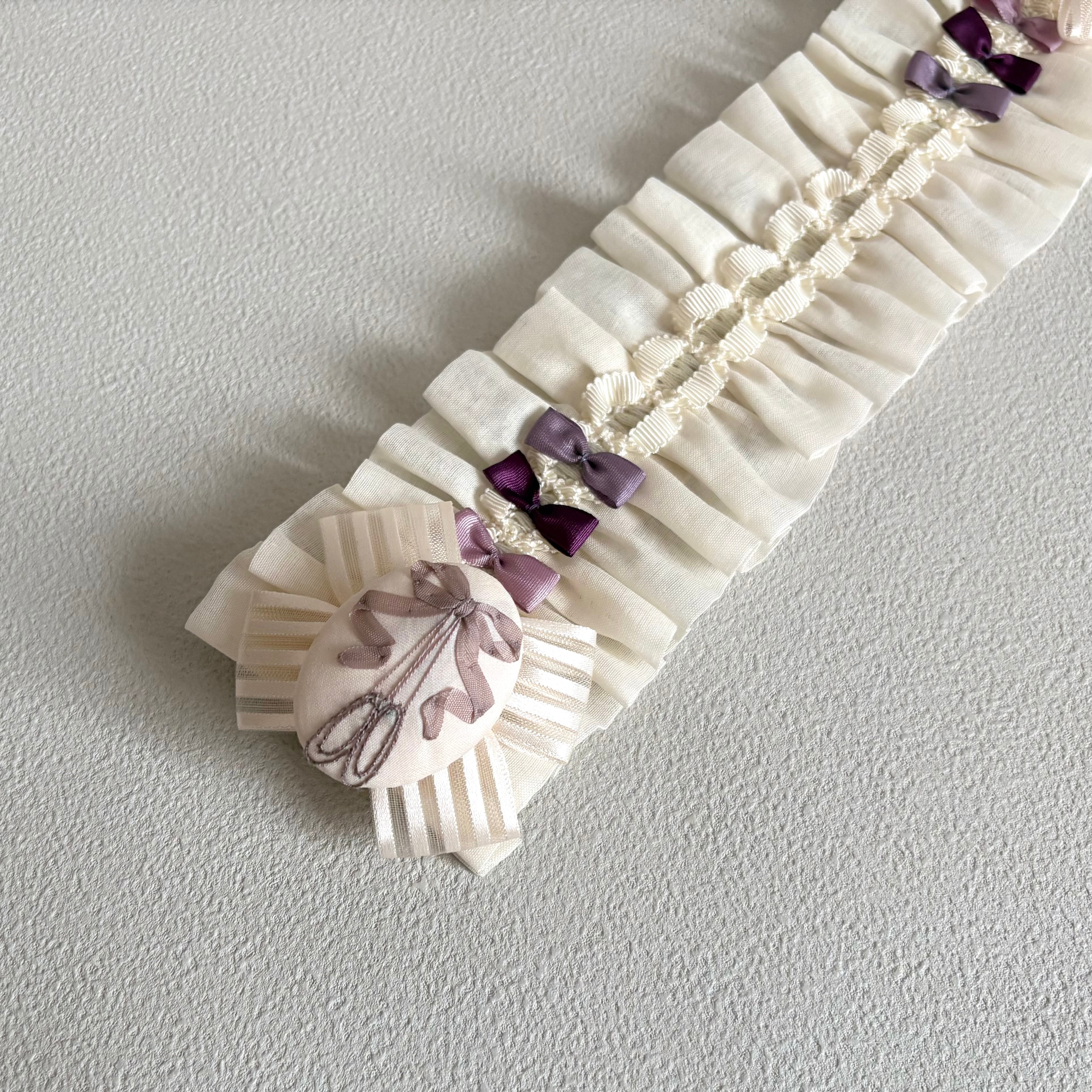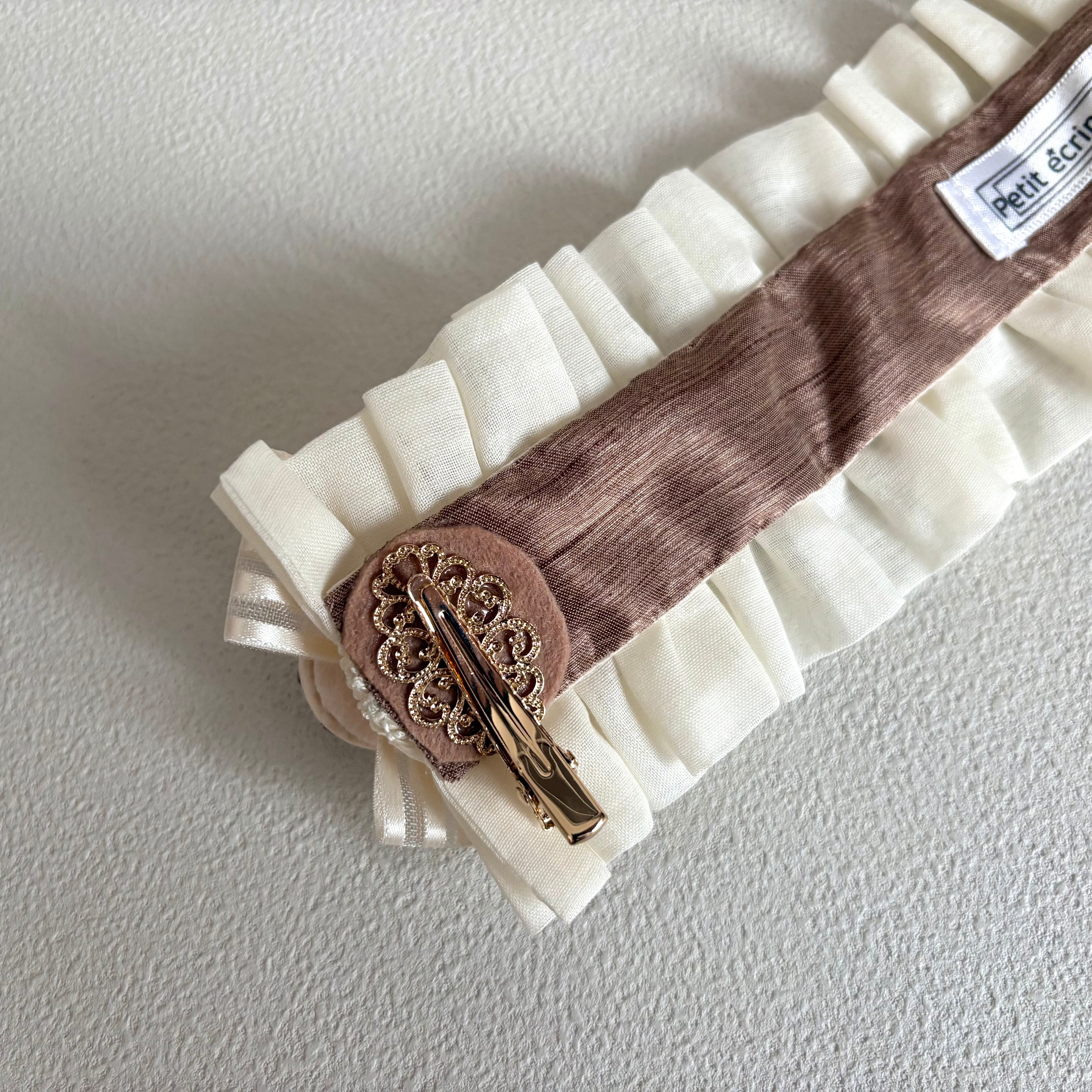 ヘッドドレス本体はコットンのオーガンジーにたっぷりギャザーを寄せ、さらっと軽やかな質感のフリルに仕立てました。