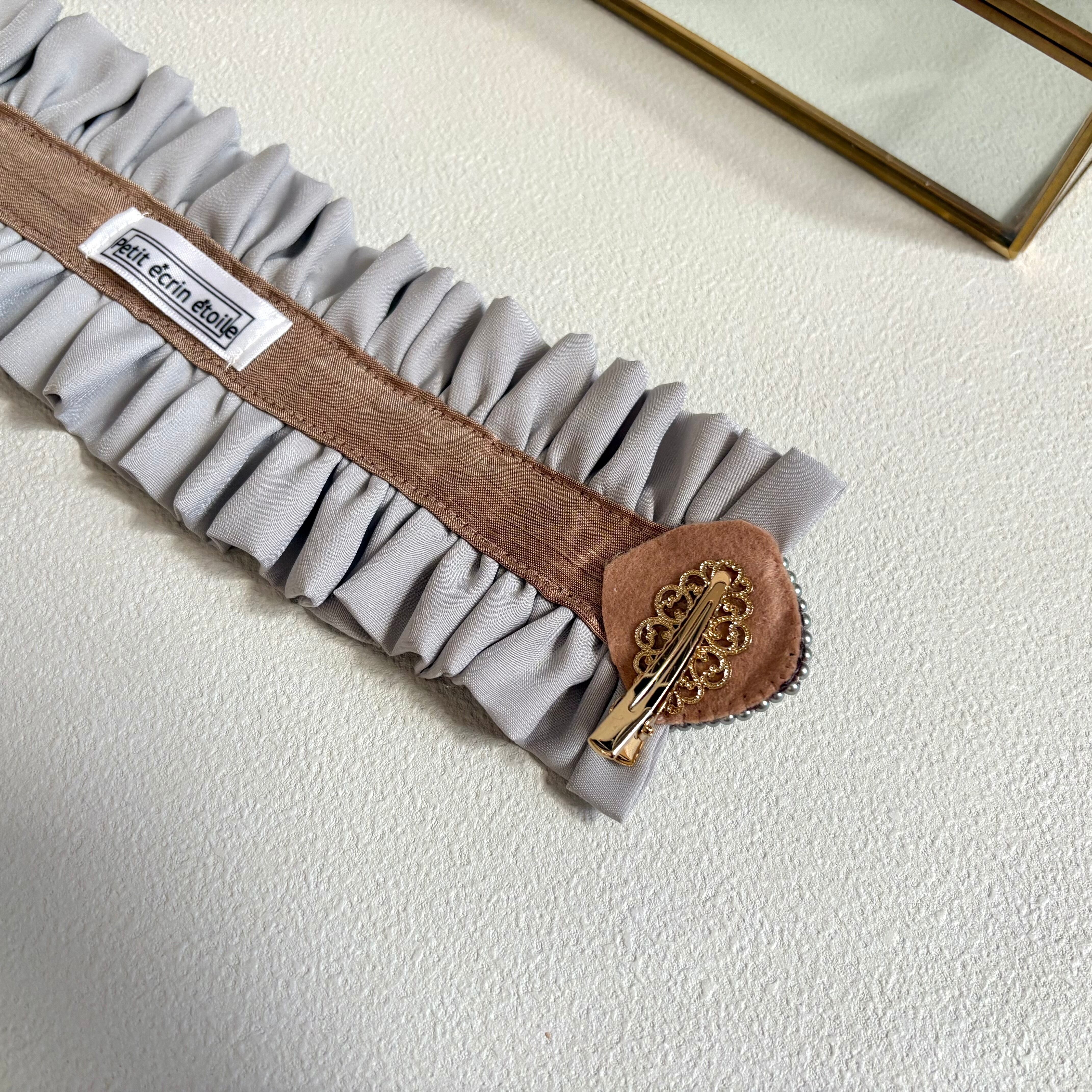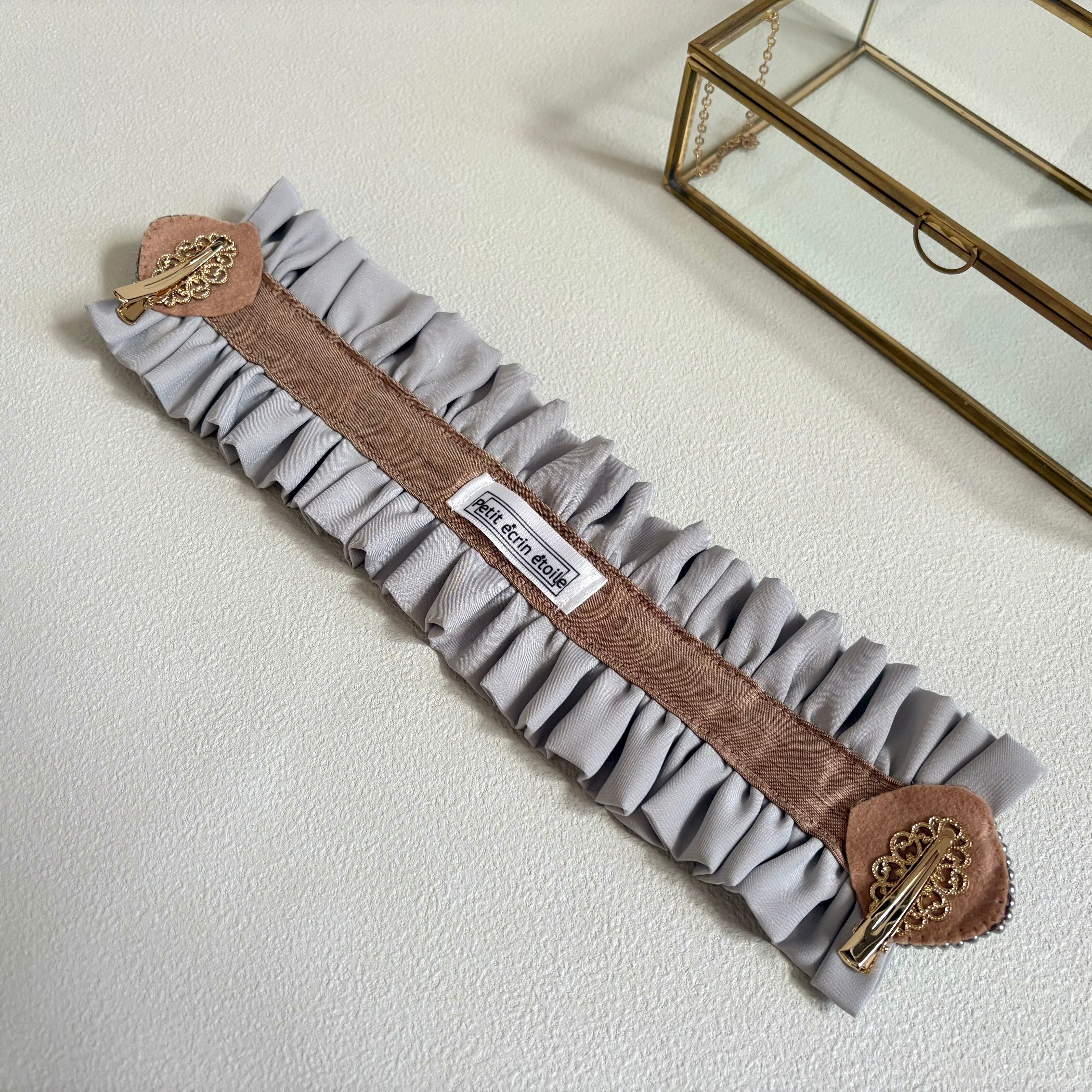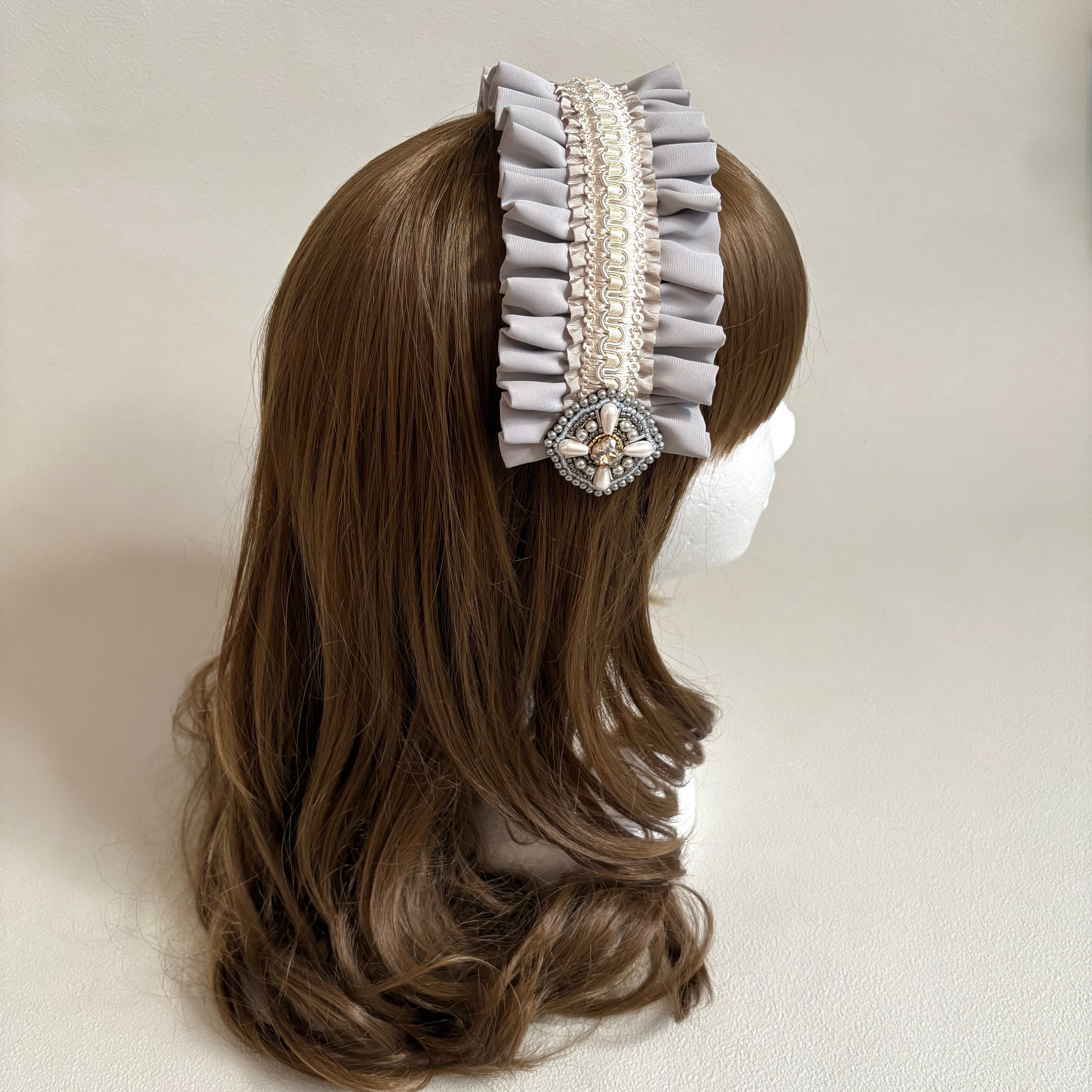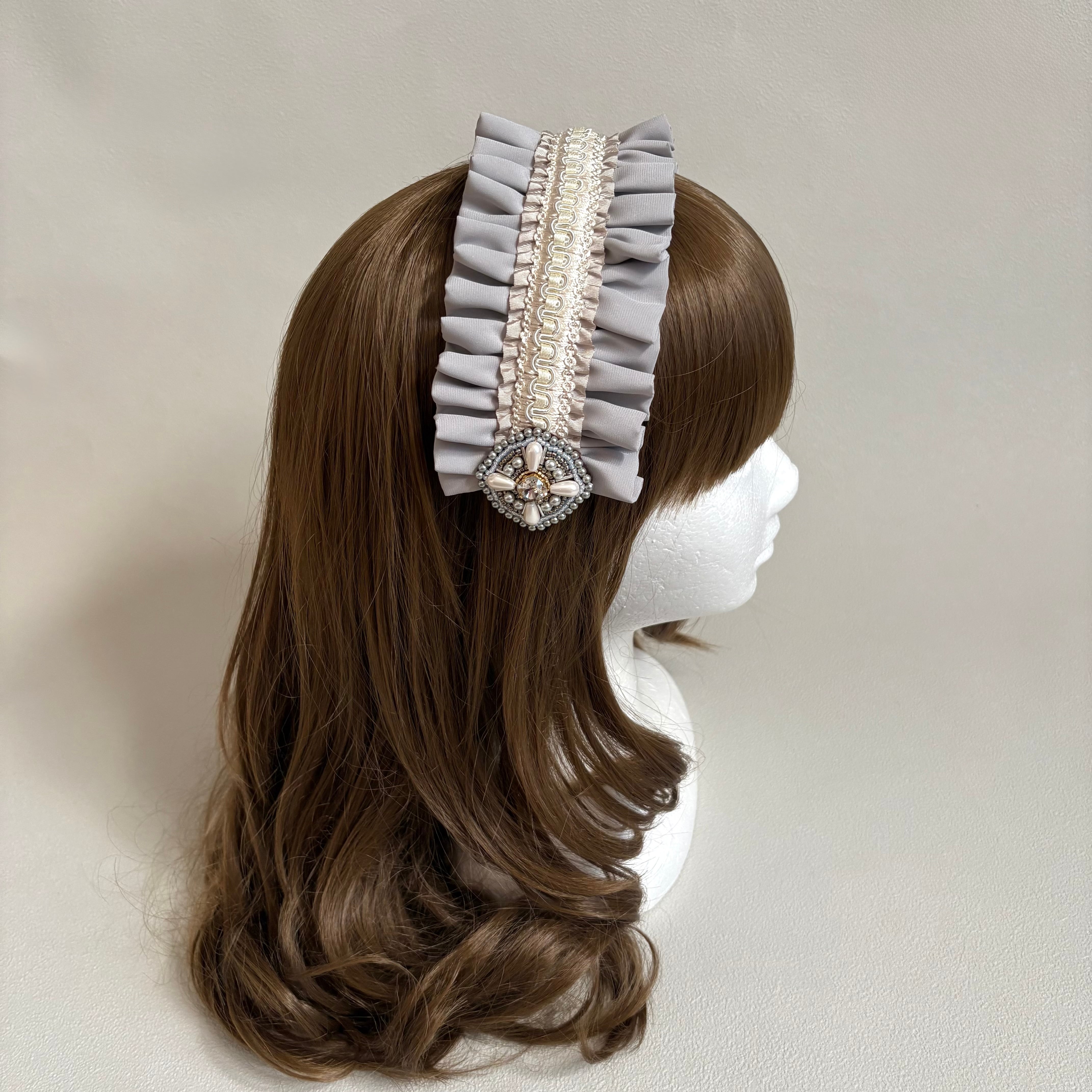 やわらかな光沢のサテンにたっぷりフリルを寄せ、細かなフリルと厚みのあるブレードをあわせてクラシカルなヘッドドレスを作りました。