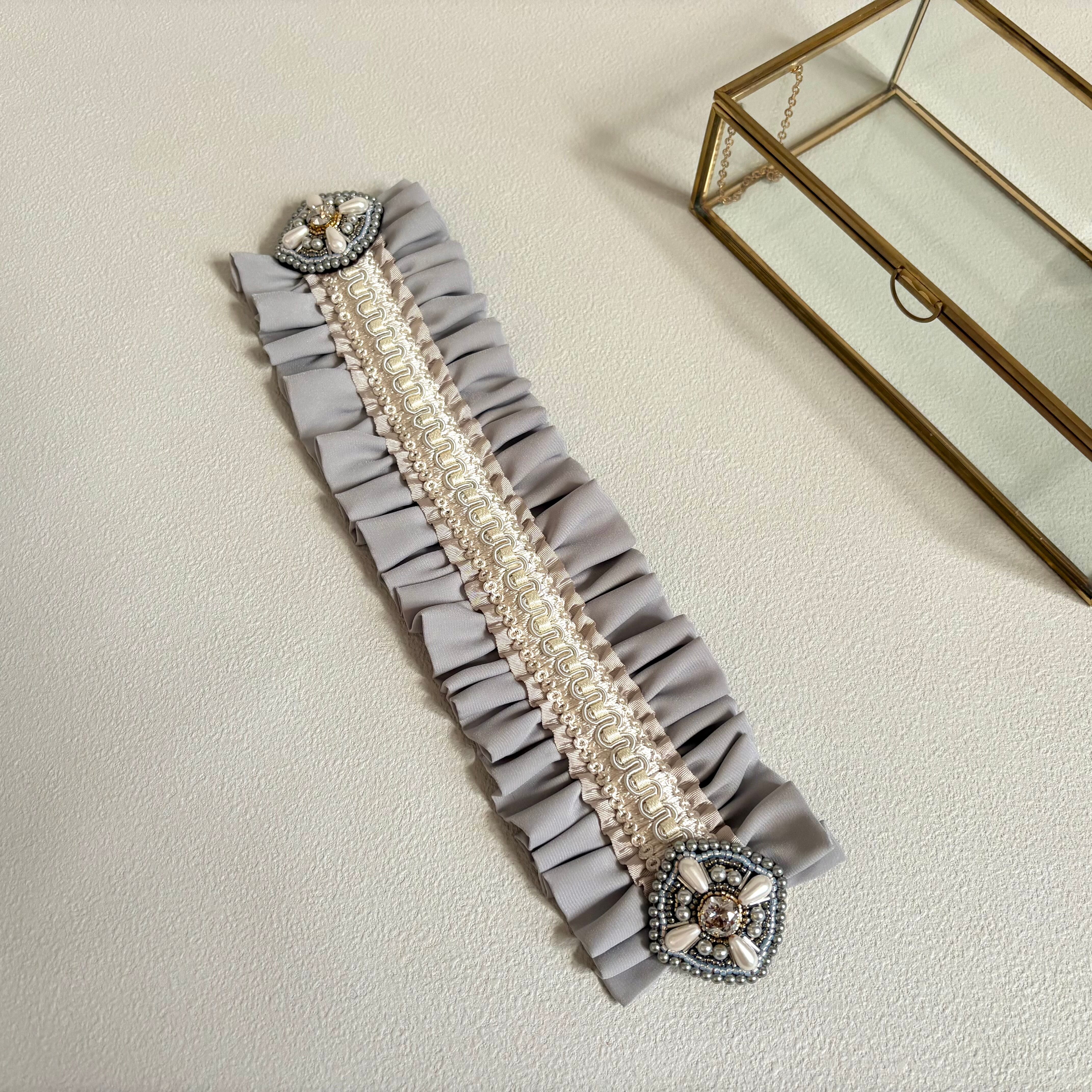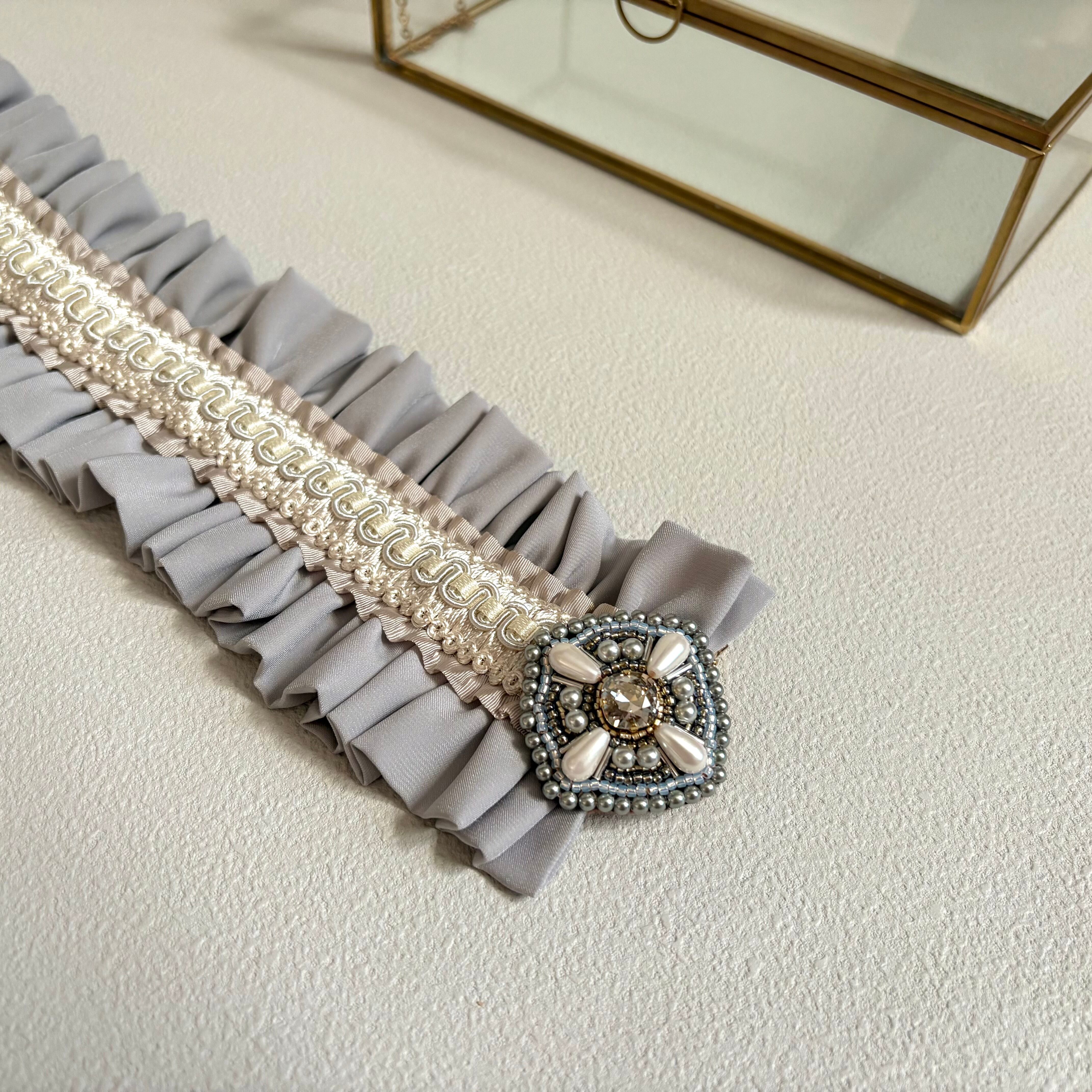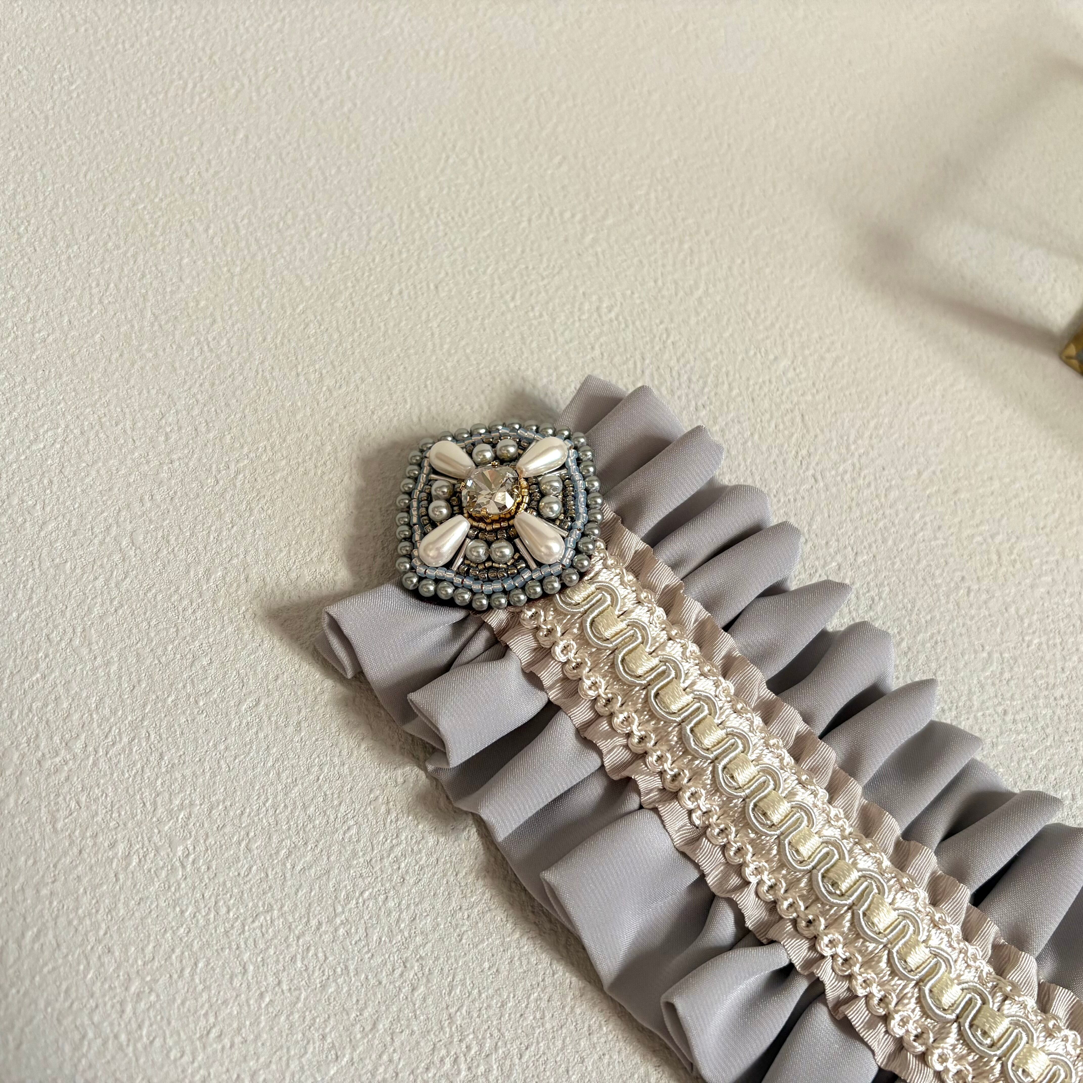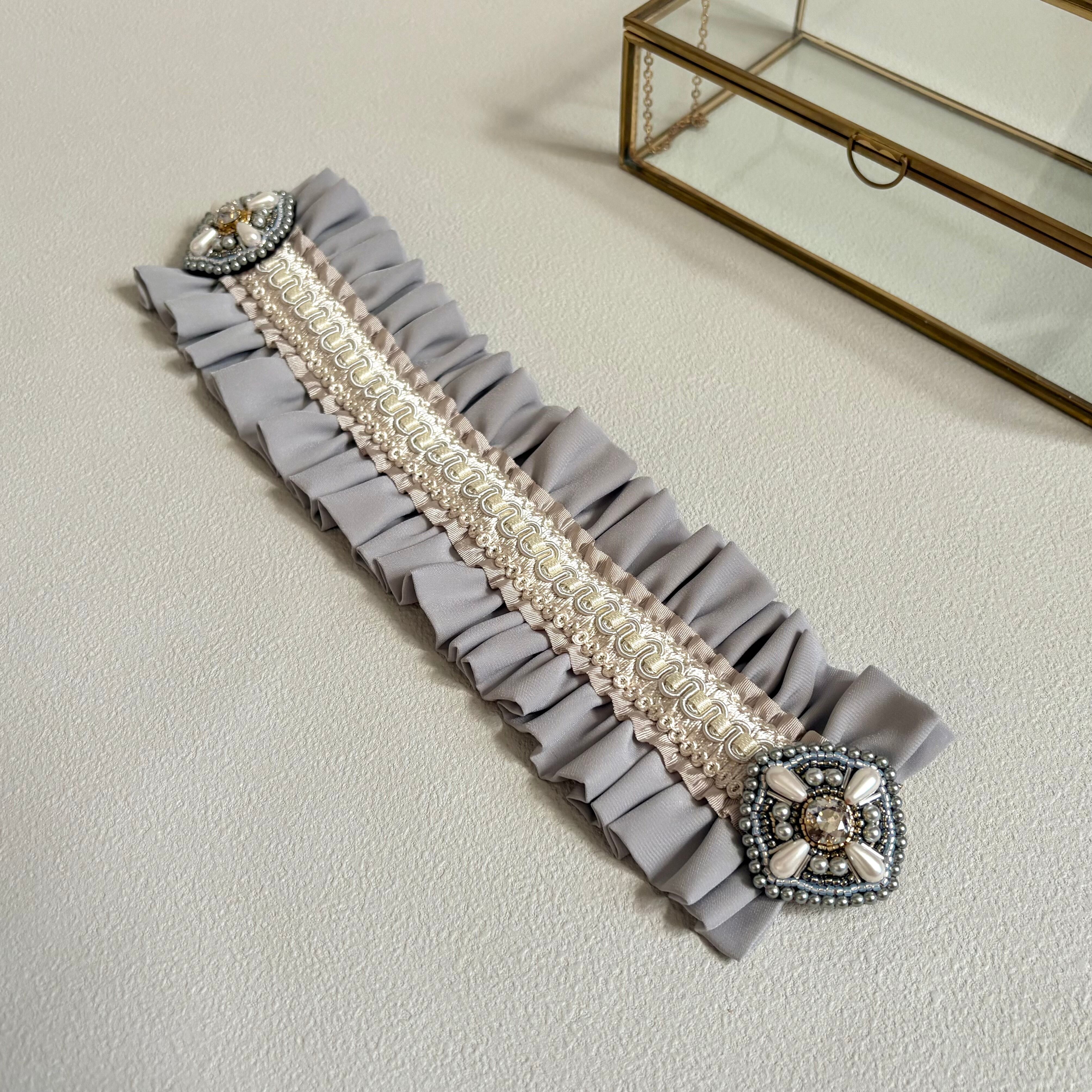 やわらかな光沢のサテンにたっぷりフリルを寄せ、細かなフリルと厚みのあるブレードをあわせてクラシカルなヘッドドレスを作りました。