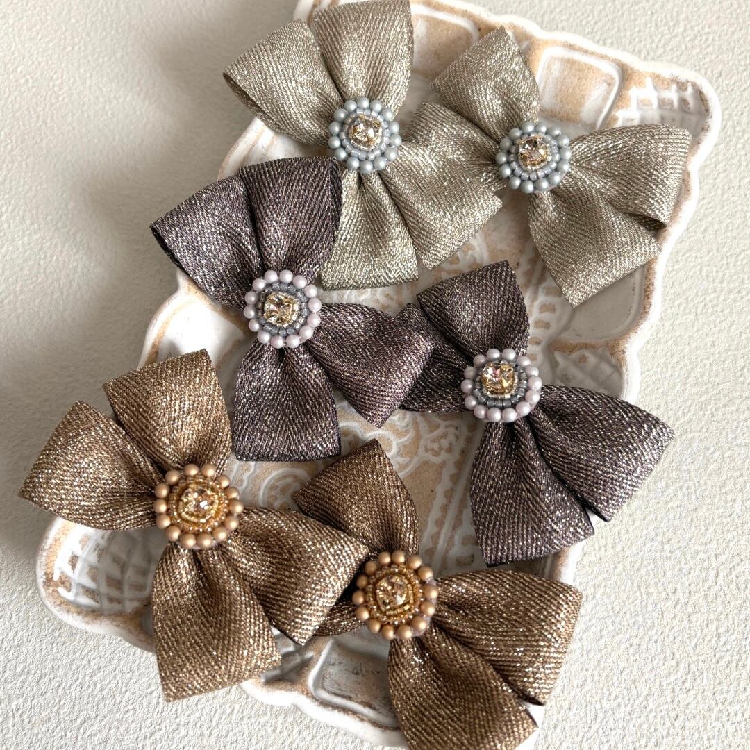 グレーやゴールドなどのベーシックで落ち着きのあるカラーを選びリボンクリップを作りました。