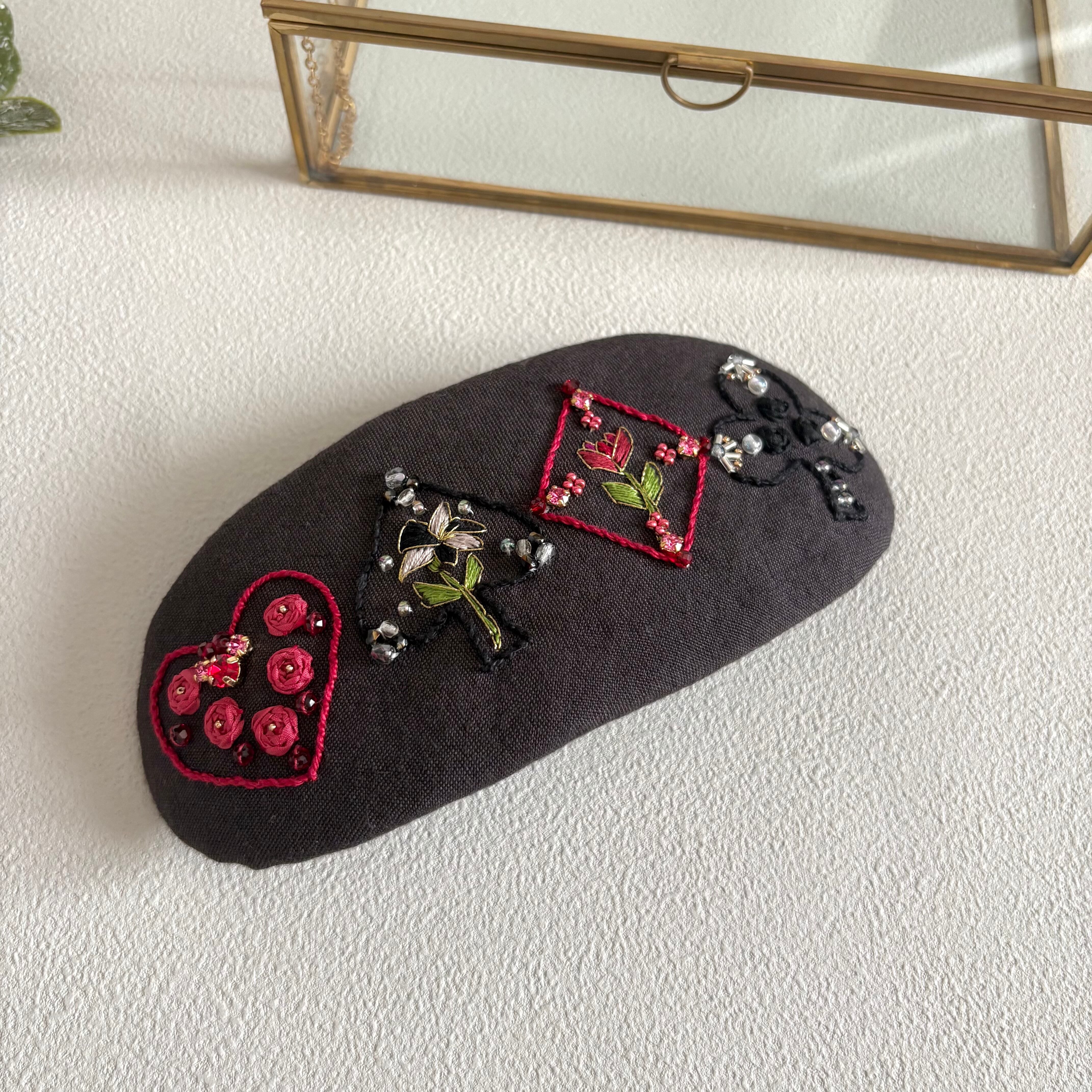 チャコールグレーのリネン生地に様々な刺繍材料、ビーズなどを用いてトランプとお花を表現した柄を刺繍しました。
