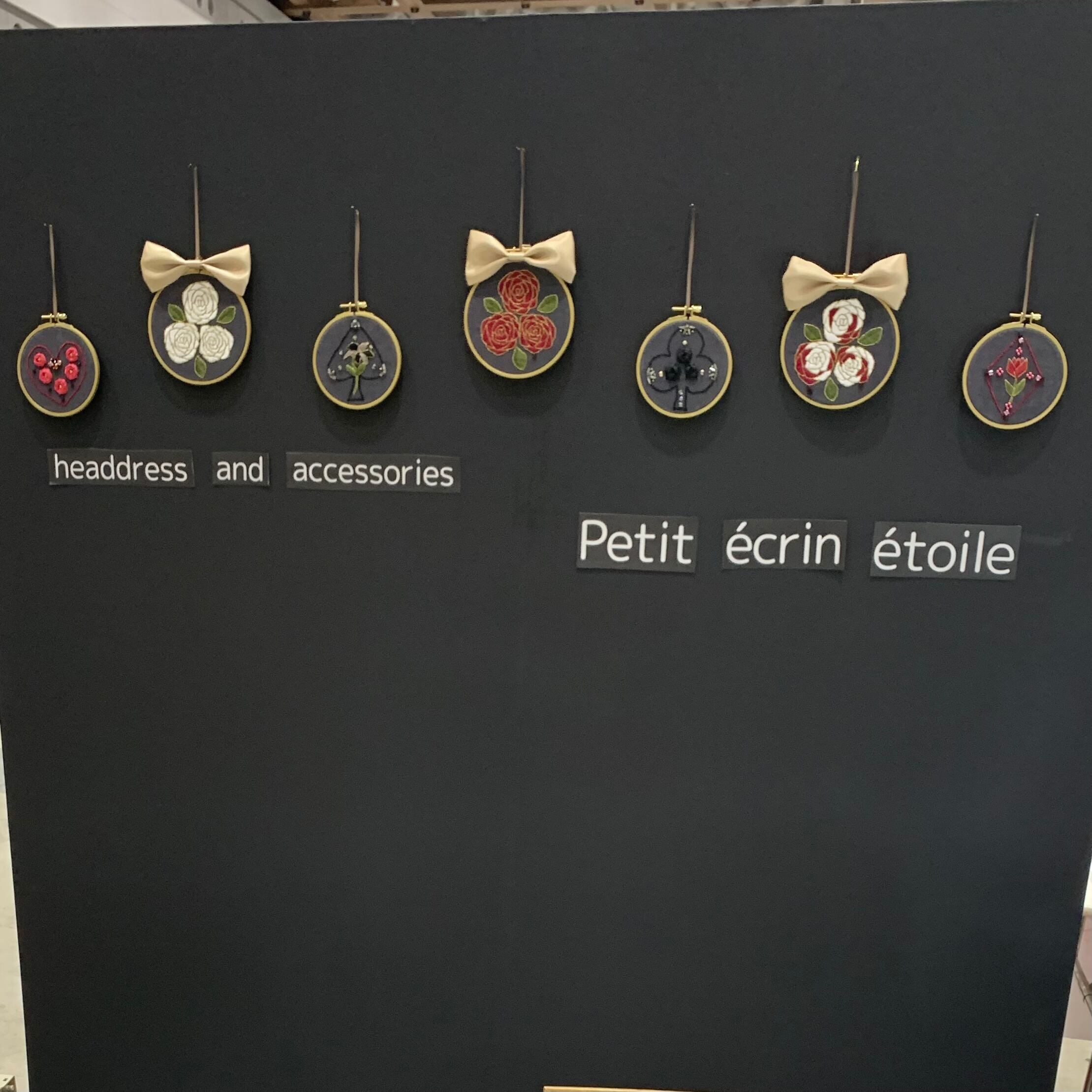 ハートとクローバーの中のバラはリボン刺繍でそれぞれ花弁の雰囲気が異なるよう刺繍しました。
