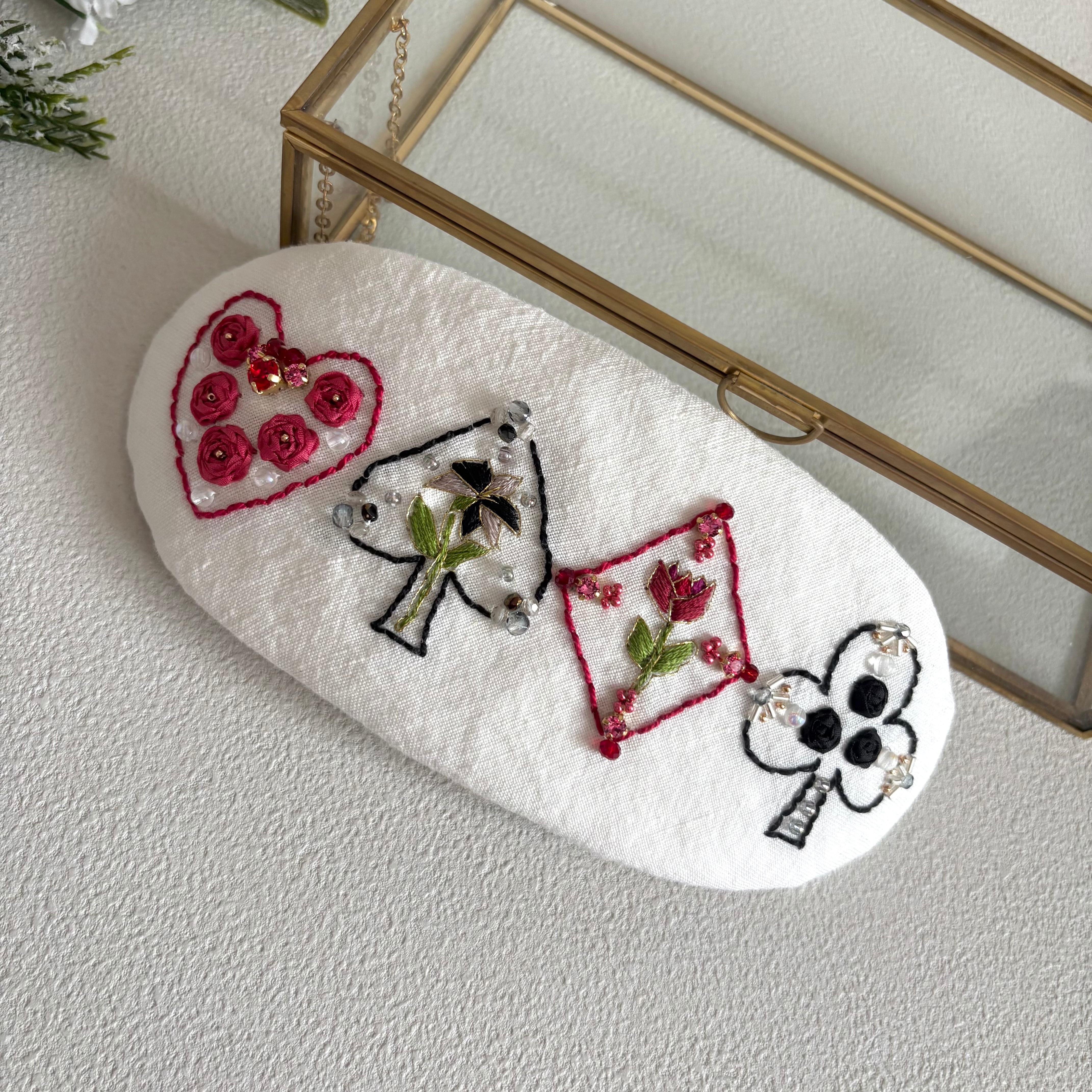 オフホワイトのリネン生地に様々な刺繍材料、ビーズなどを用いてトランプとお花を表現した柄を刺繍しました。