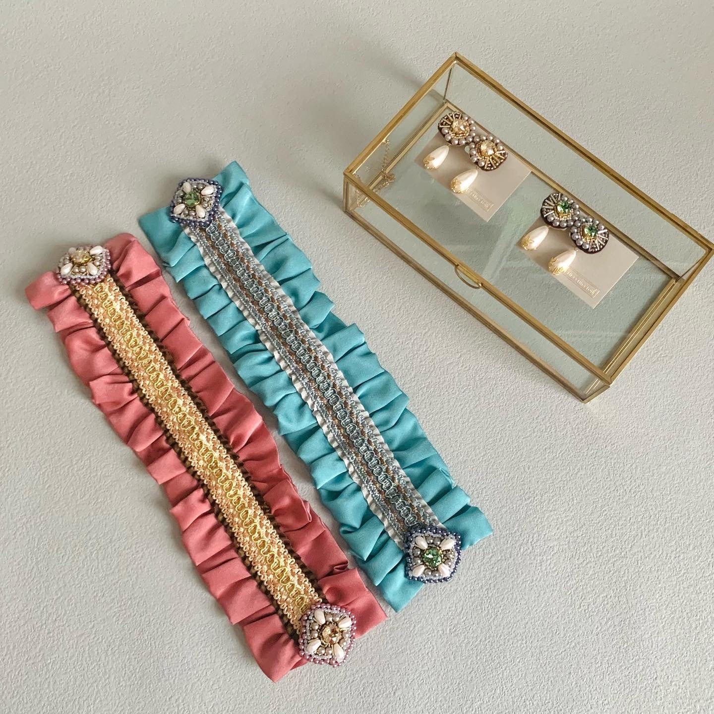 中央のクリスタルやビーズ、カラーパールには肌なじみの良い色を中心に使用しており、お顔まわりに優しく華やぎを与えてくれます。