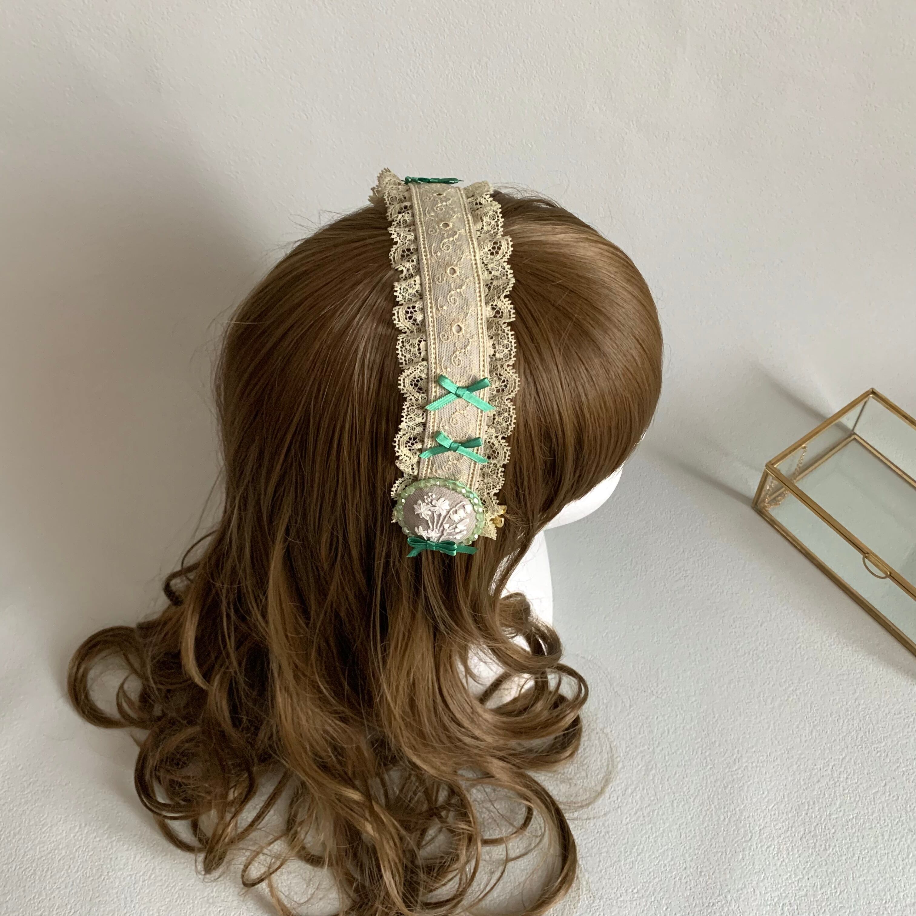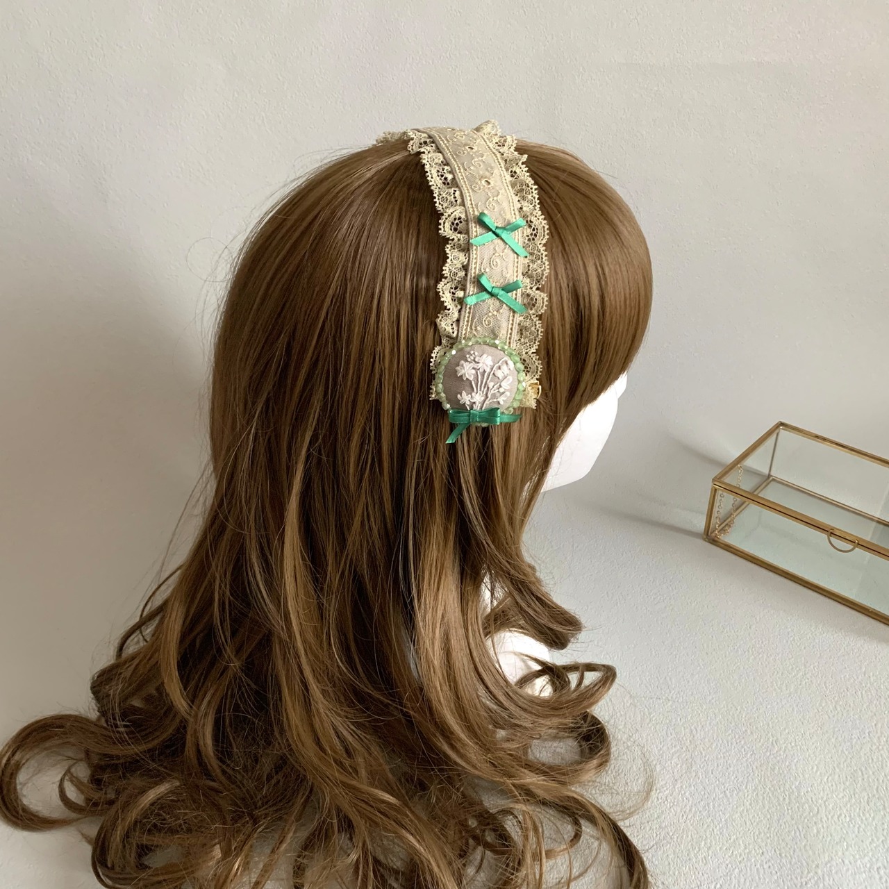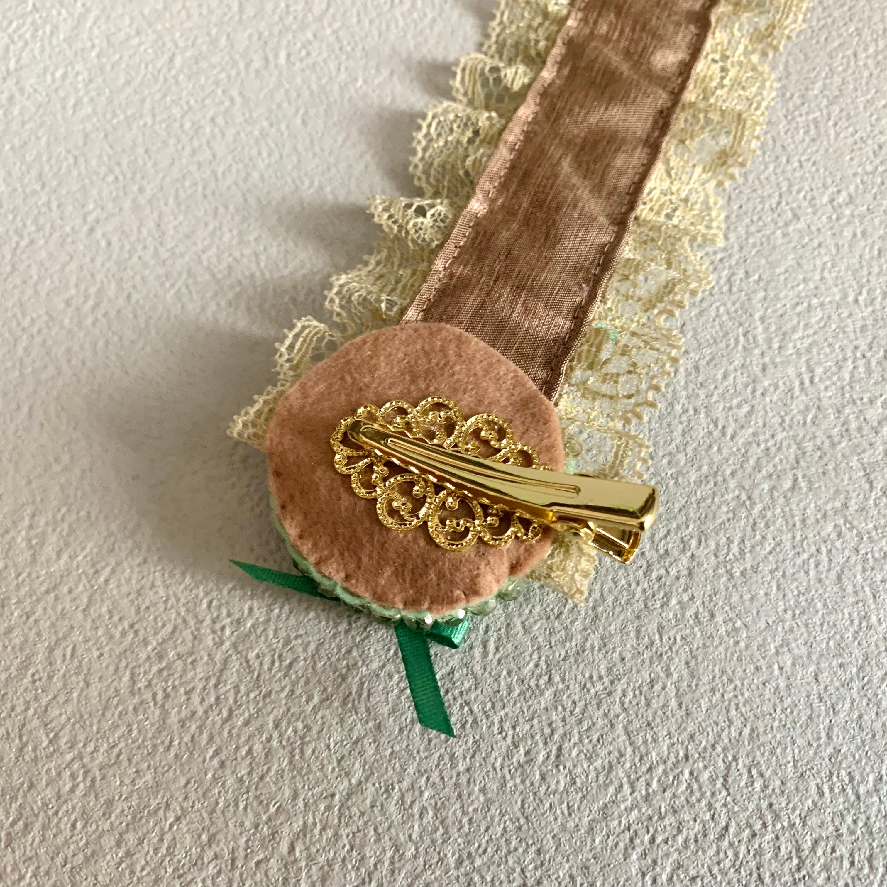 ハーフリネンと繊細な模様のレースでヘッドドレスの土台を作り、少し濃い色の小さなリボンをアクセントとして付けました。