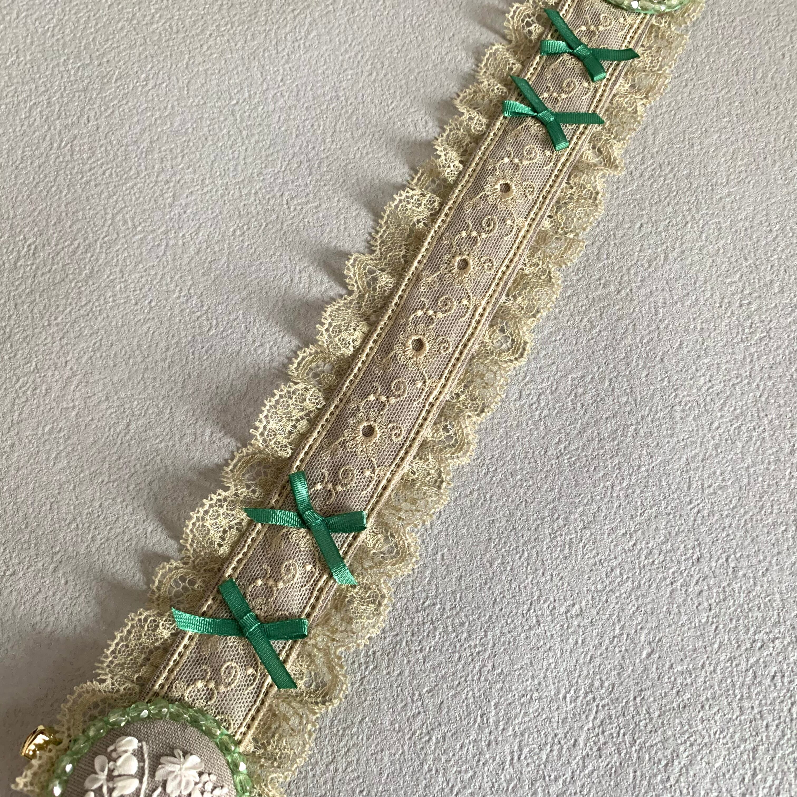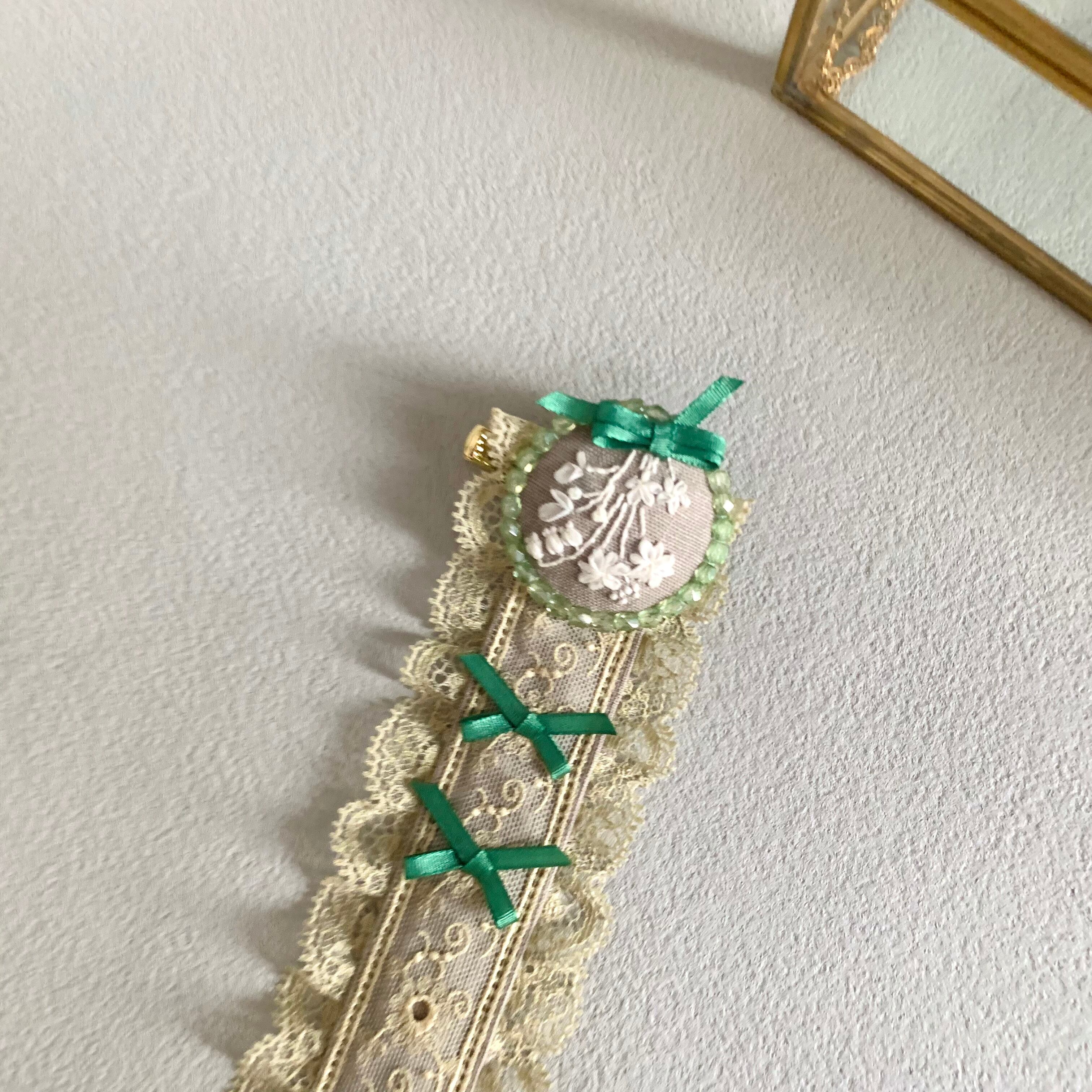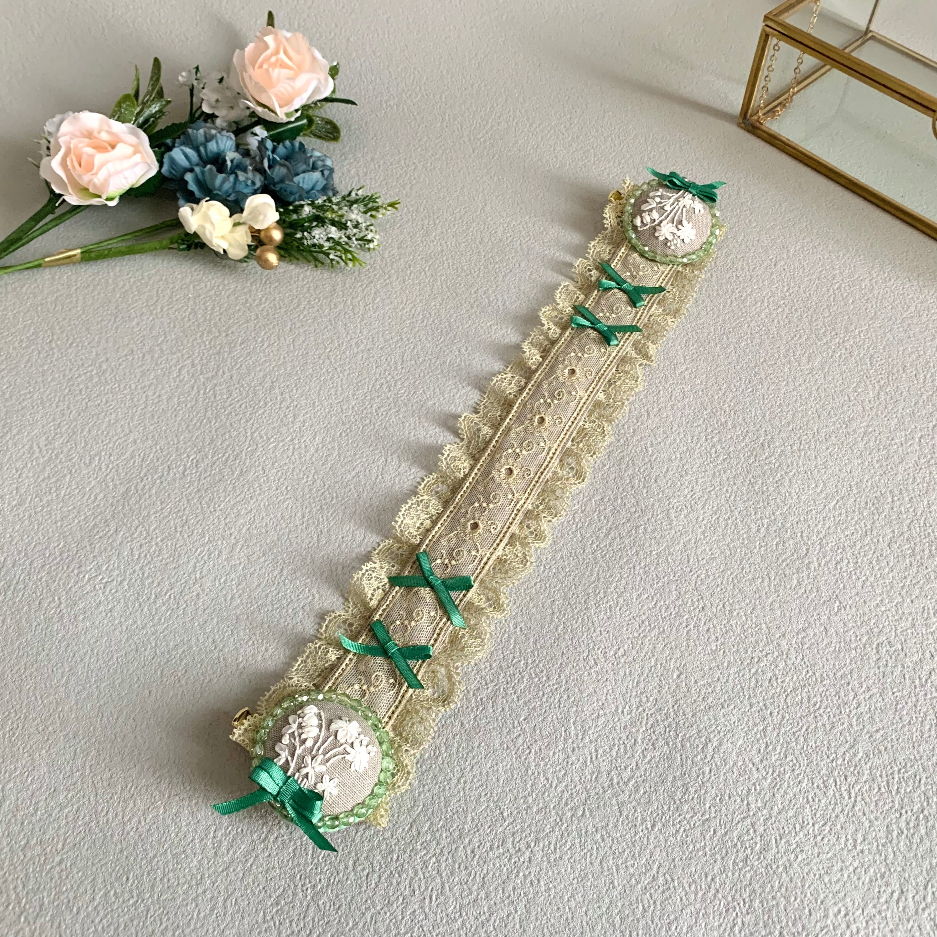 ハーフリネンと繊細な模様のレースでヘッドドレスの土台を作り、少し濃い色の小さなリボンをアクセントとして付けました。