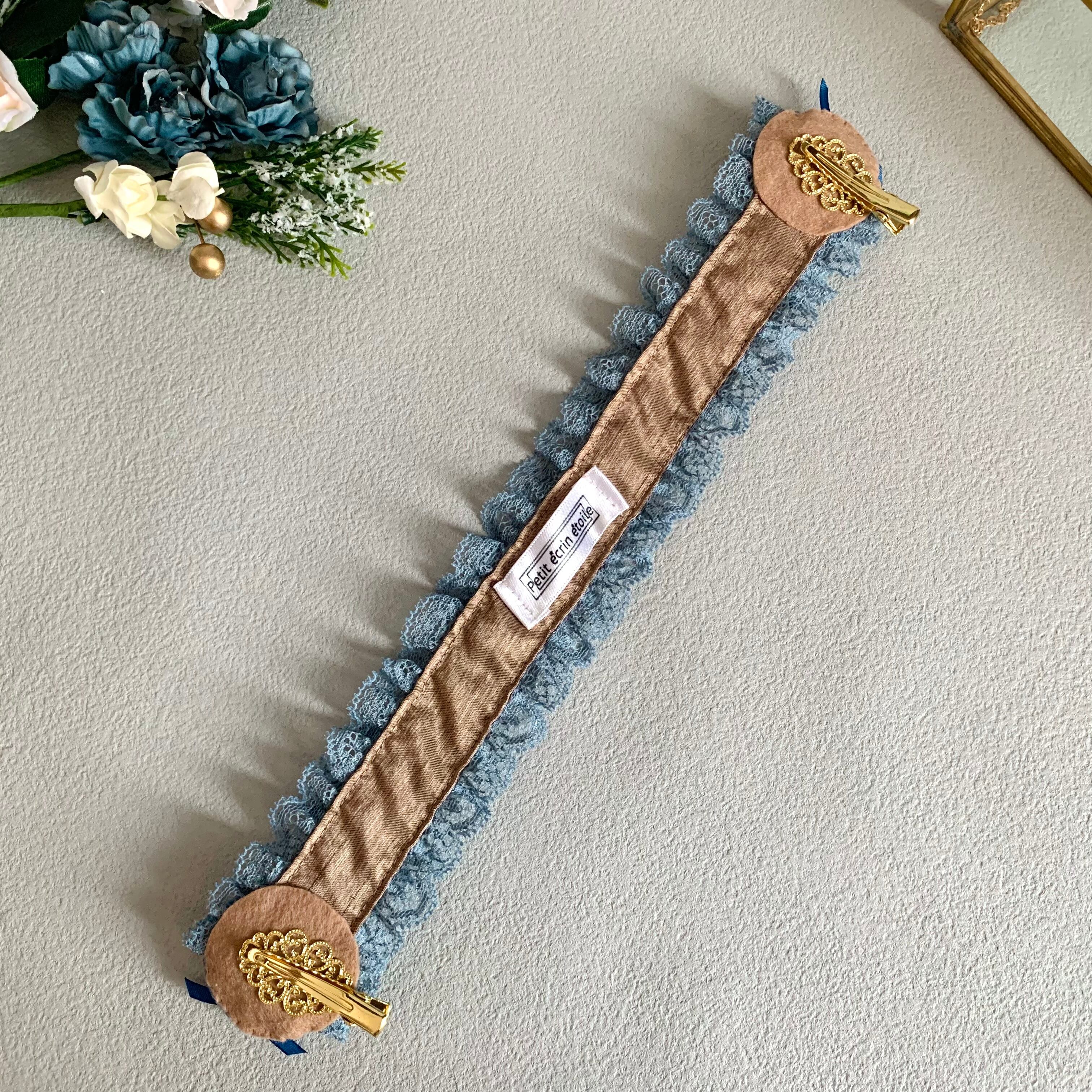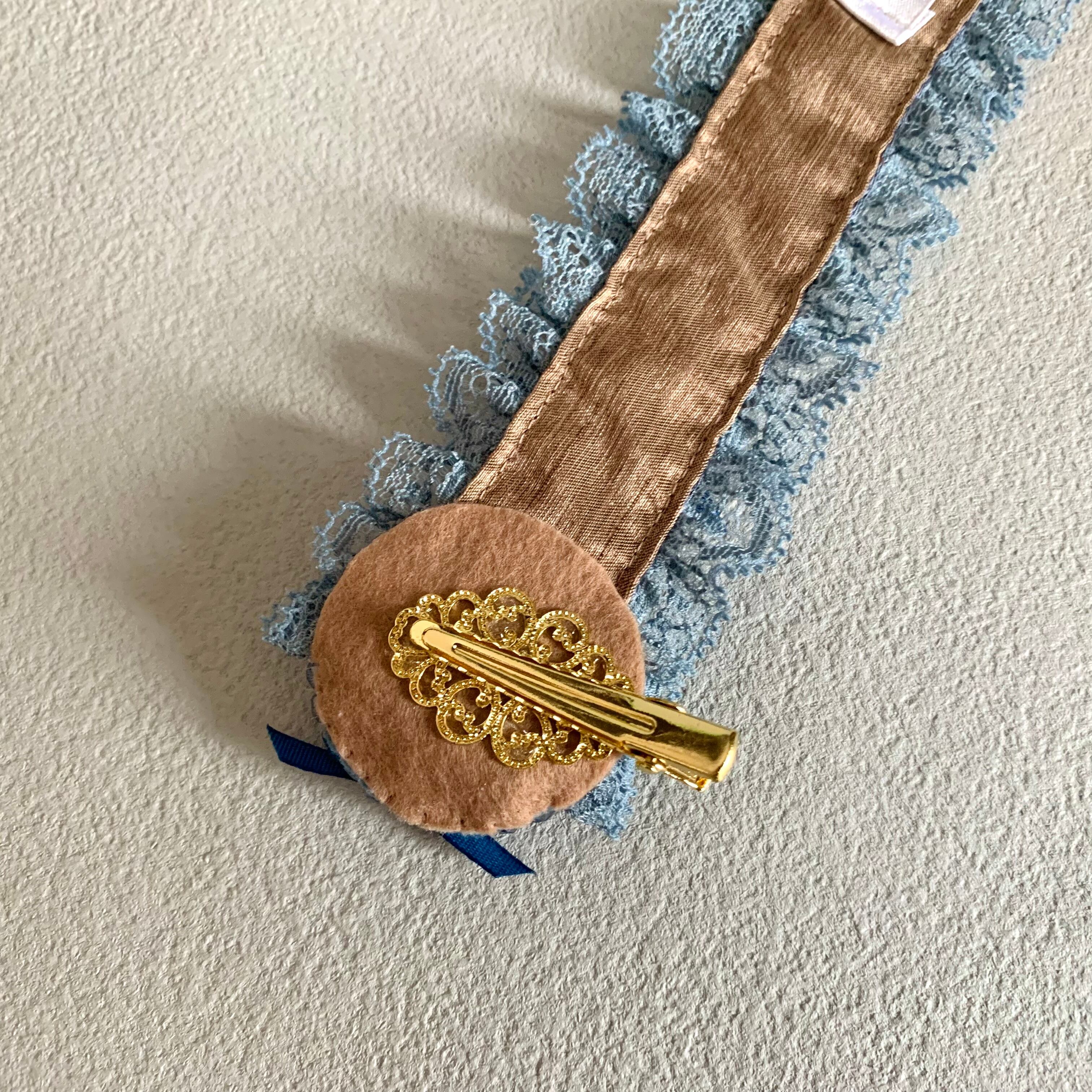 ハーフリネンと繊細な模様のレースでヘッドドレスの土台を作り、少し濃い色の小さなリボンをアクセントとして付けました。