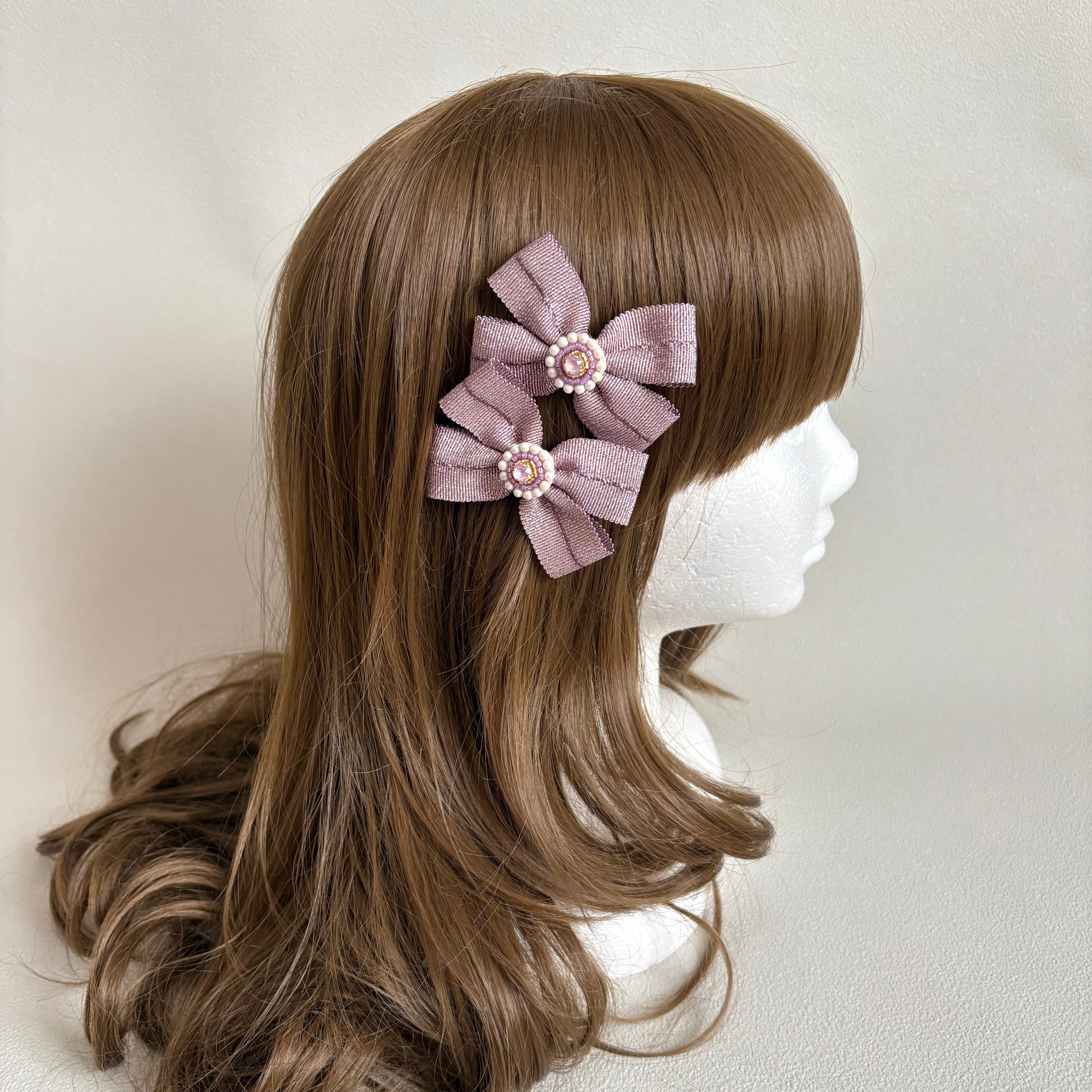 甘さのある色味にラメが入ったグログランリボンを用い、ヘアクリップを作りました。