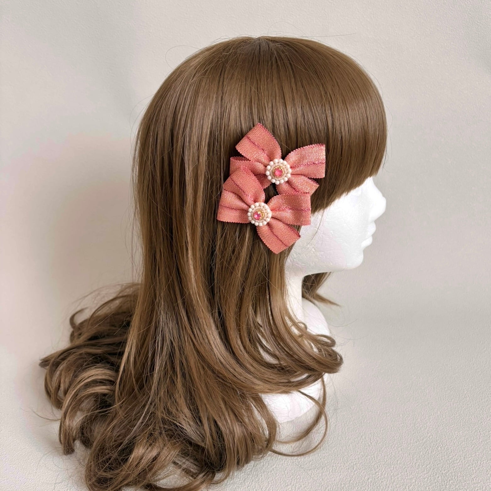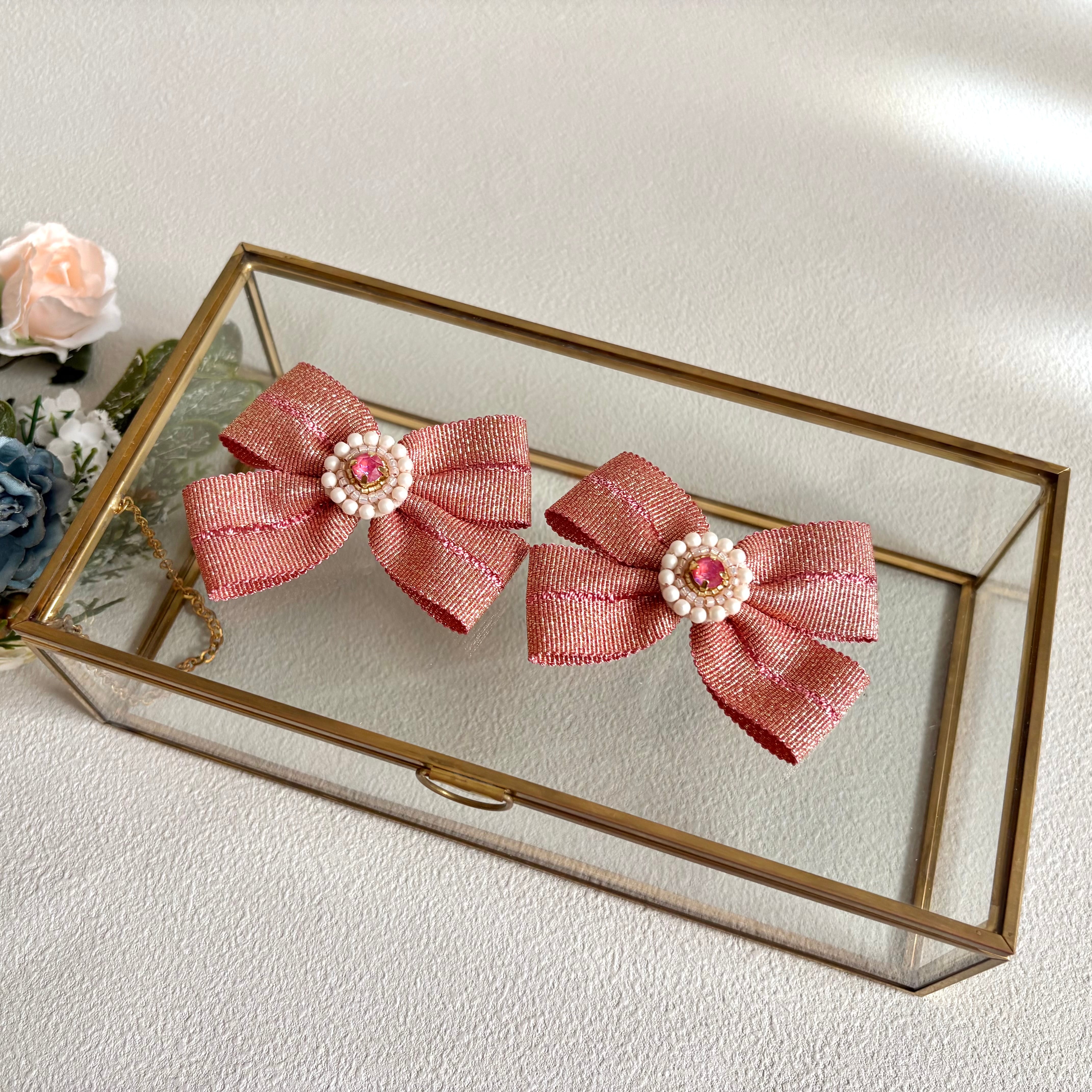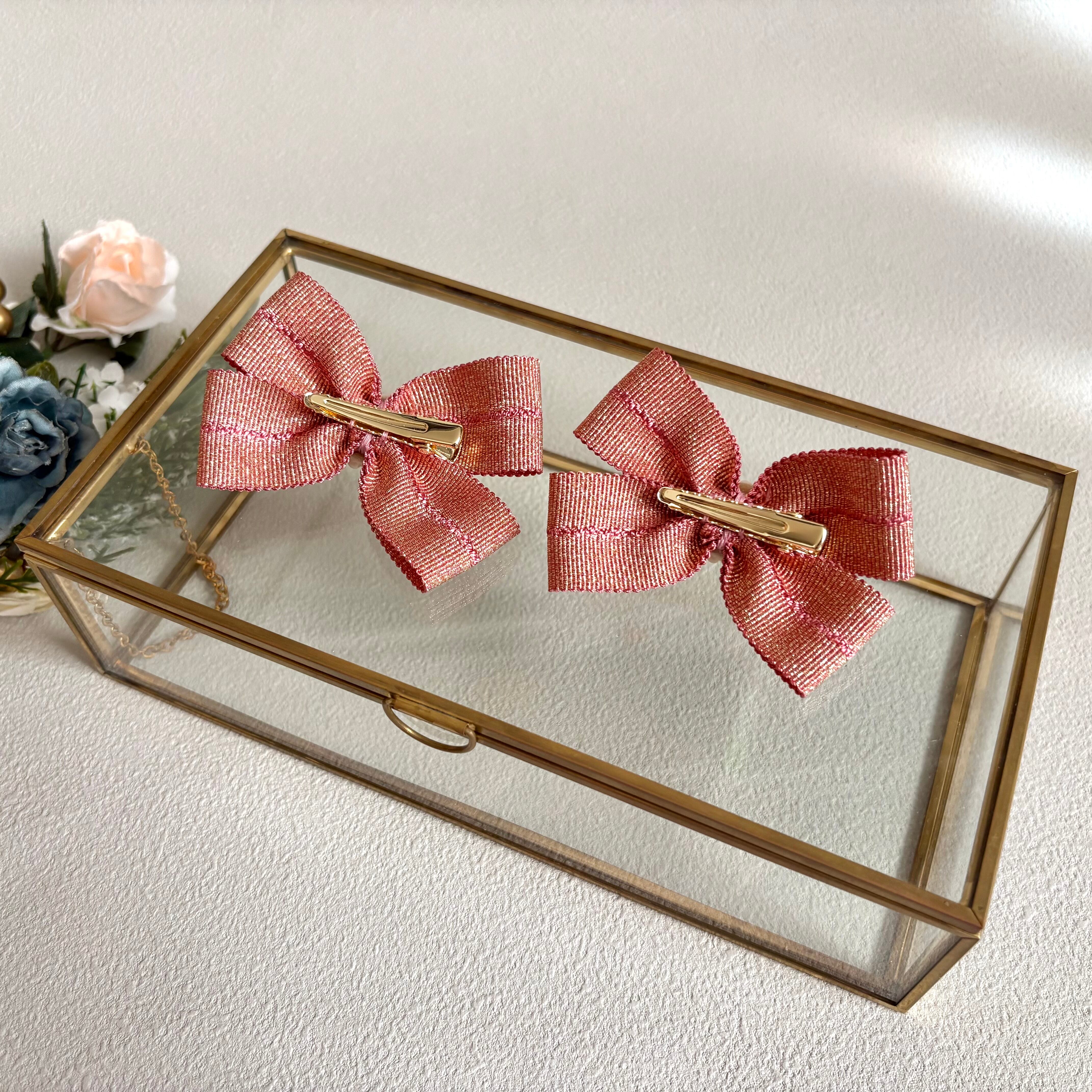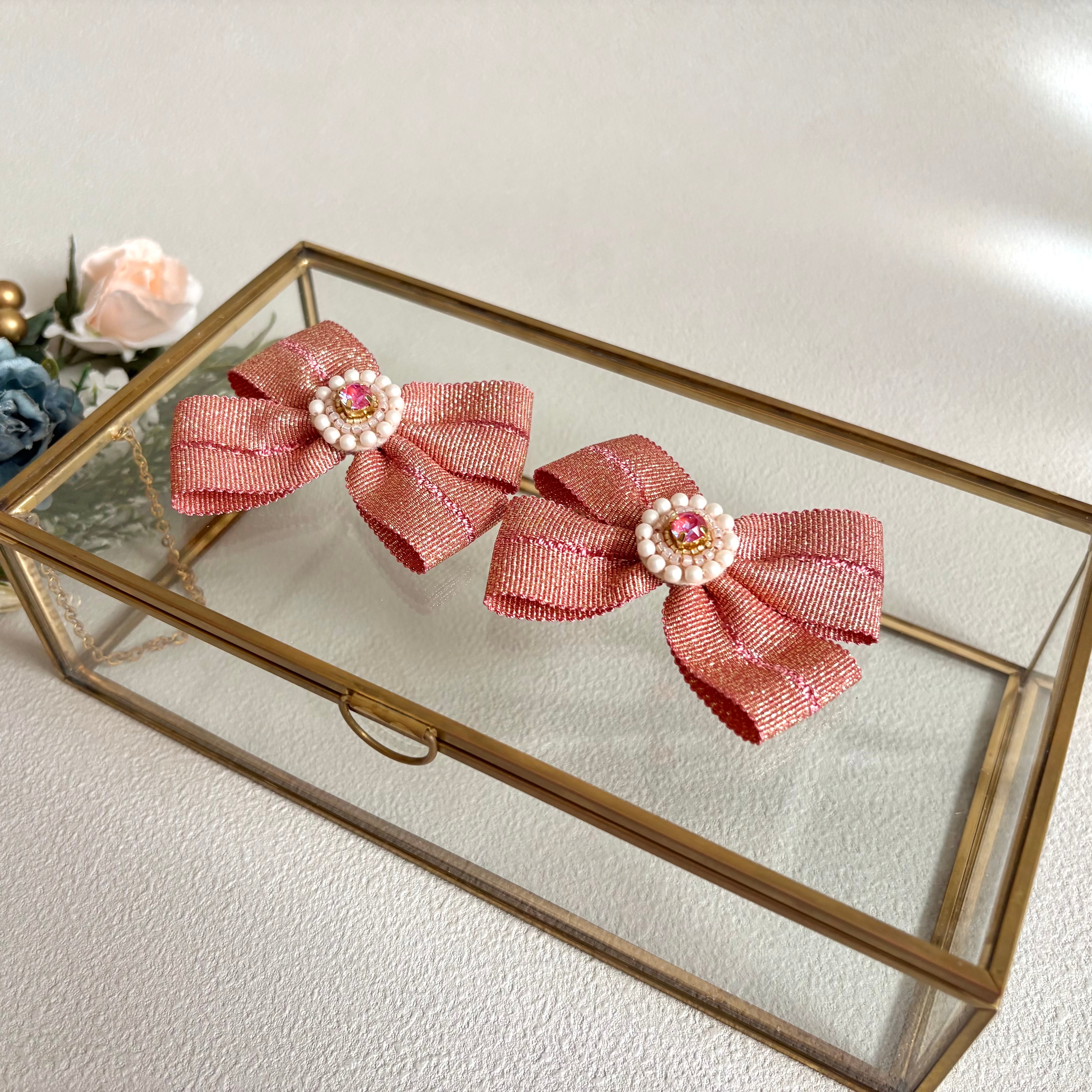 甘さのある色味にラメが入ったグログランリボンを用い、ヘアクリップを作りました。