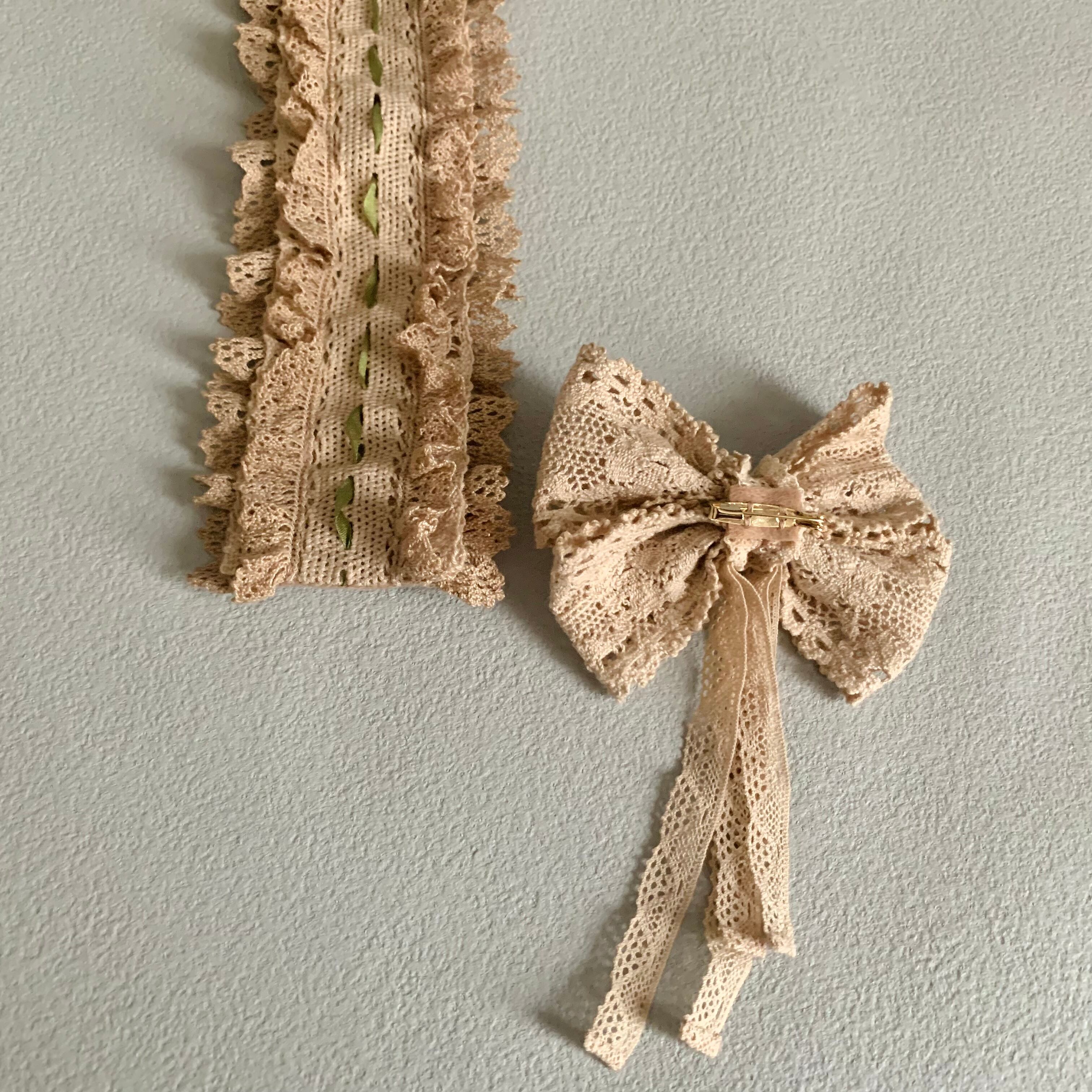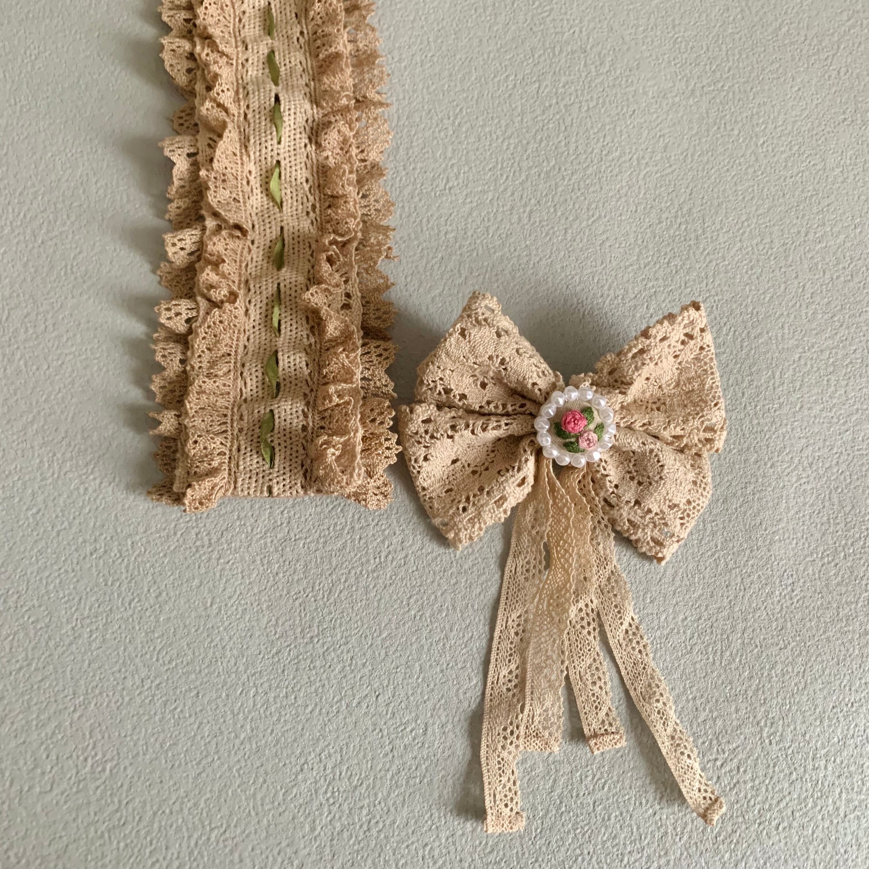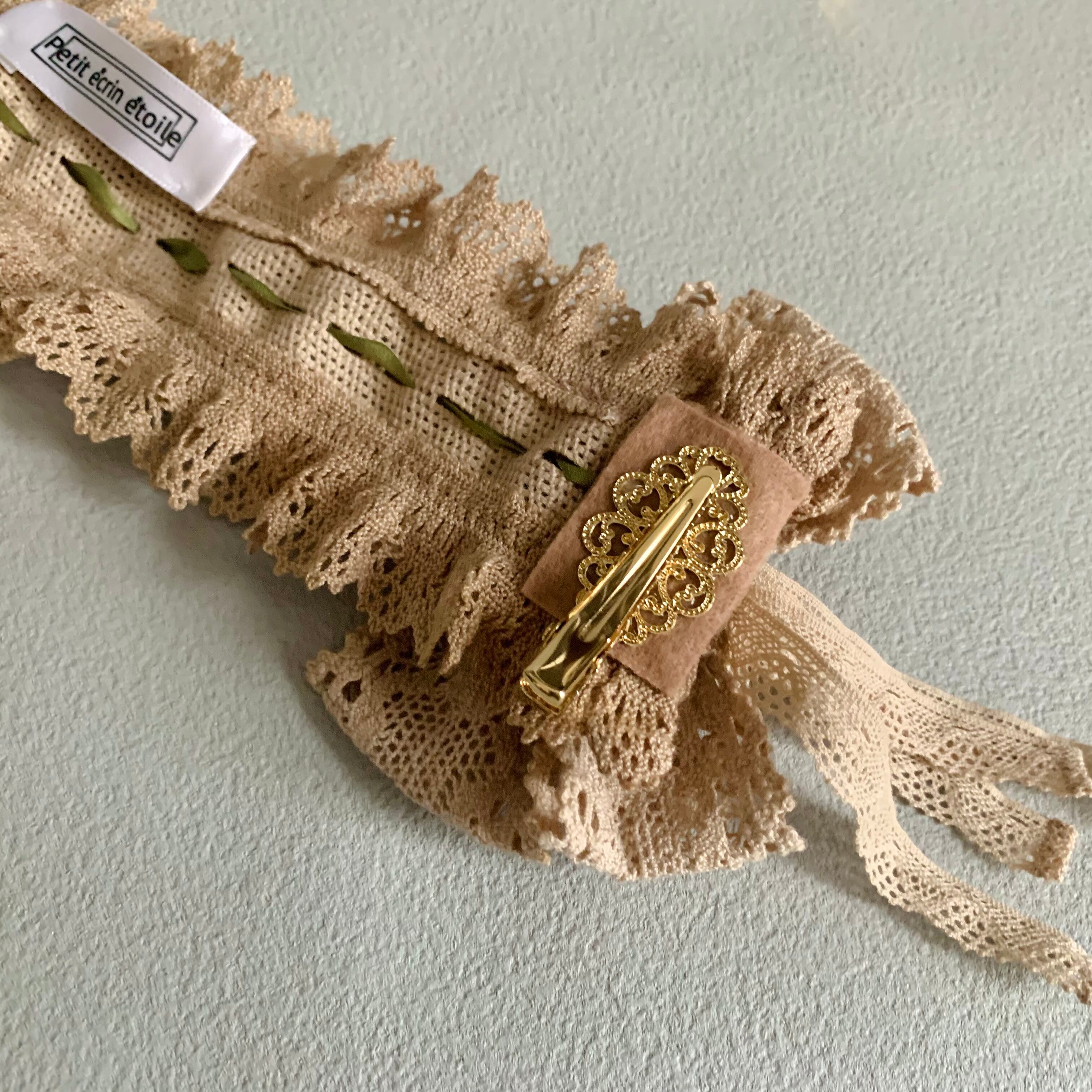 紅茶染めをしたトーションレースをたっぷり使用し軽やかなヘッドドレスを作りました。