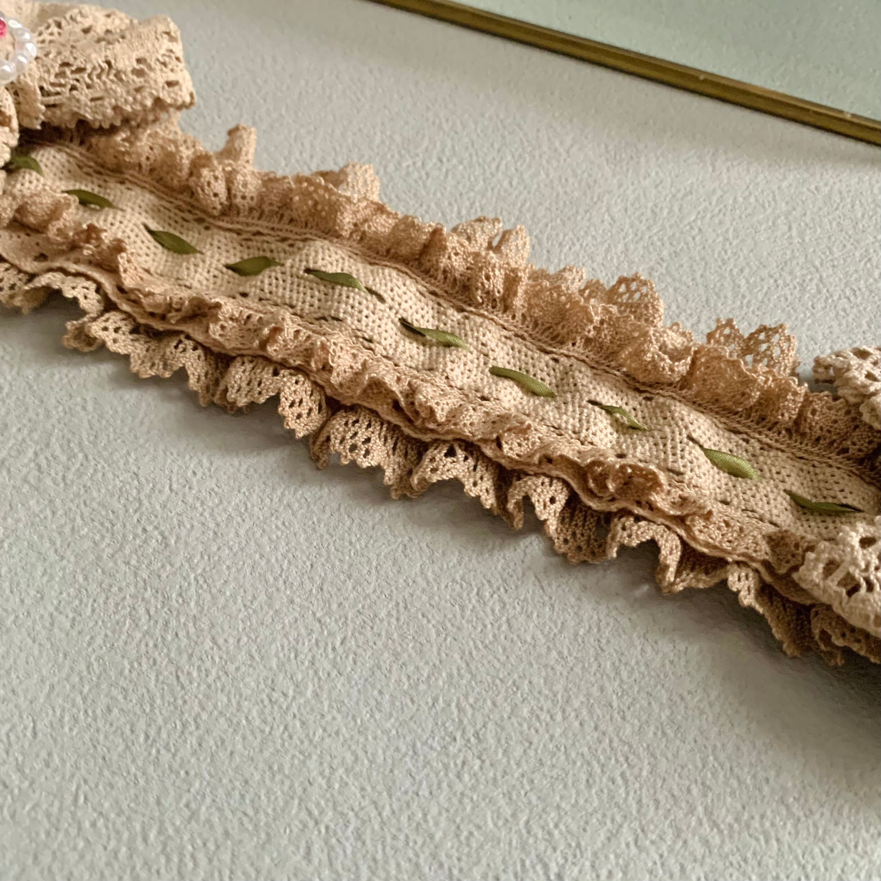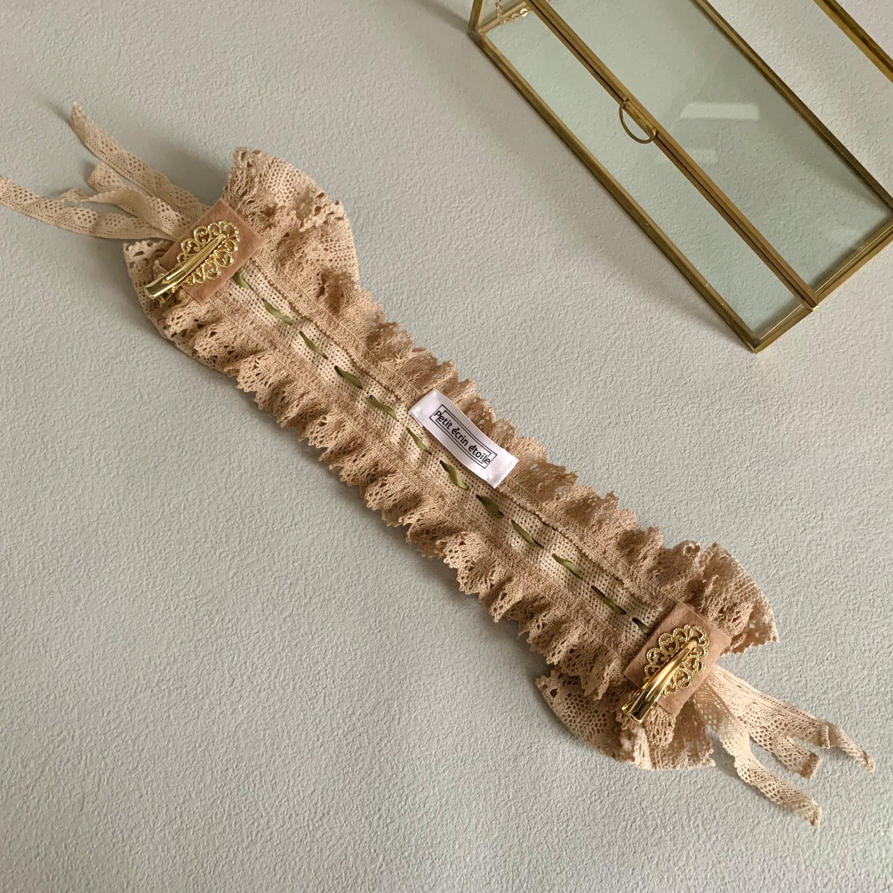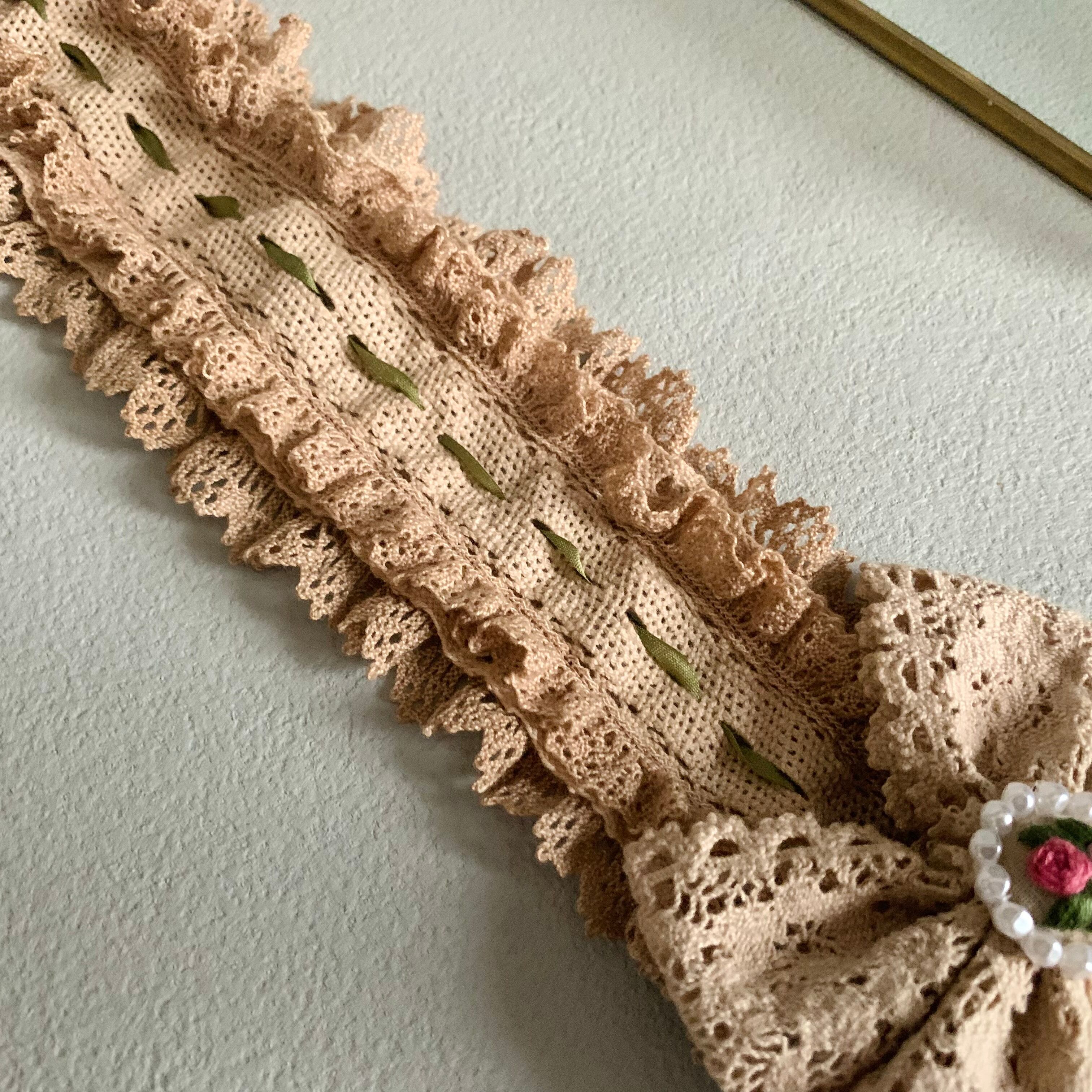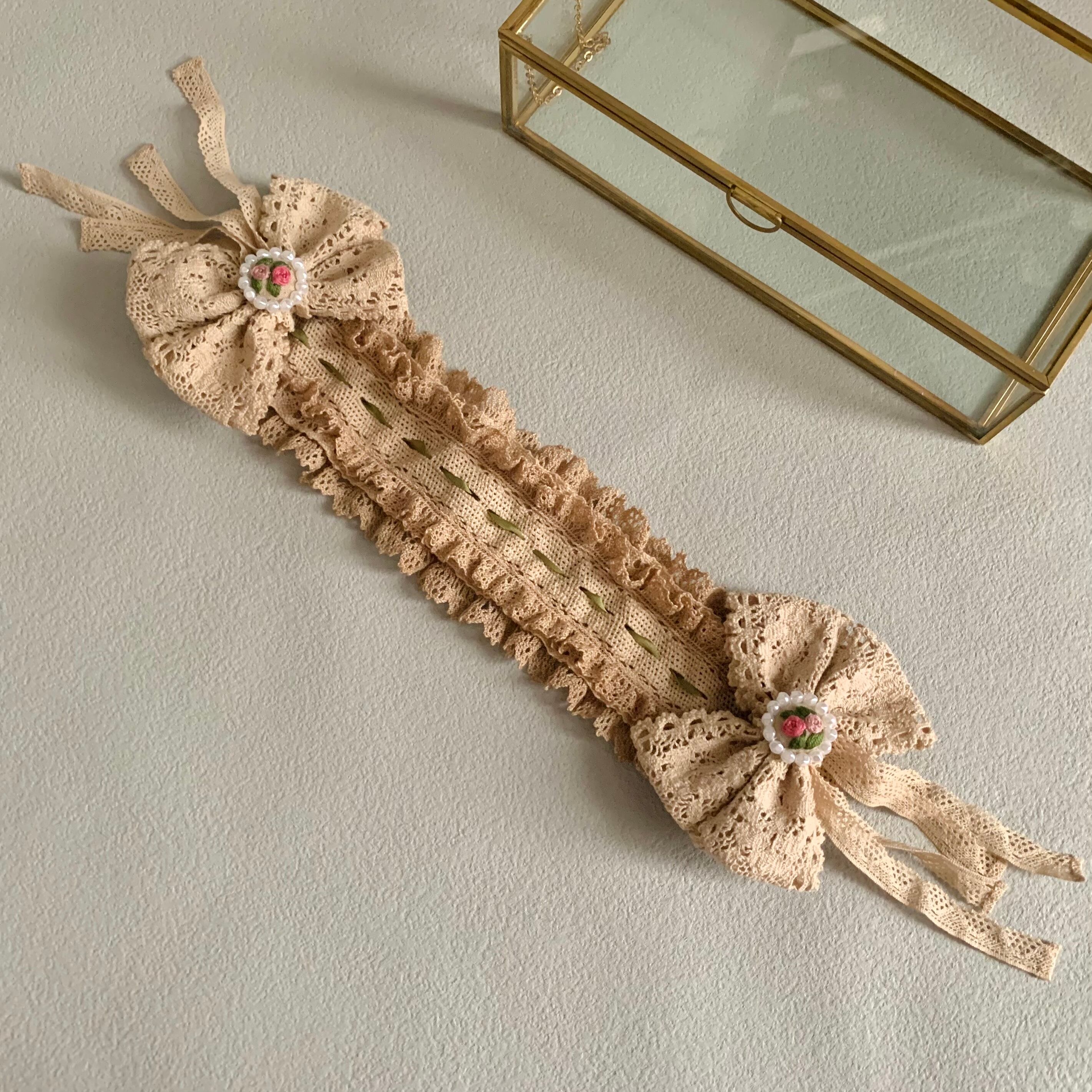 紅茶染めをしたトーションレースをたっぷり使用し軽やかなヘッドドレスを作りました。