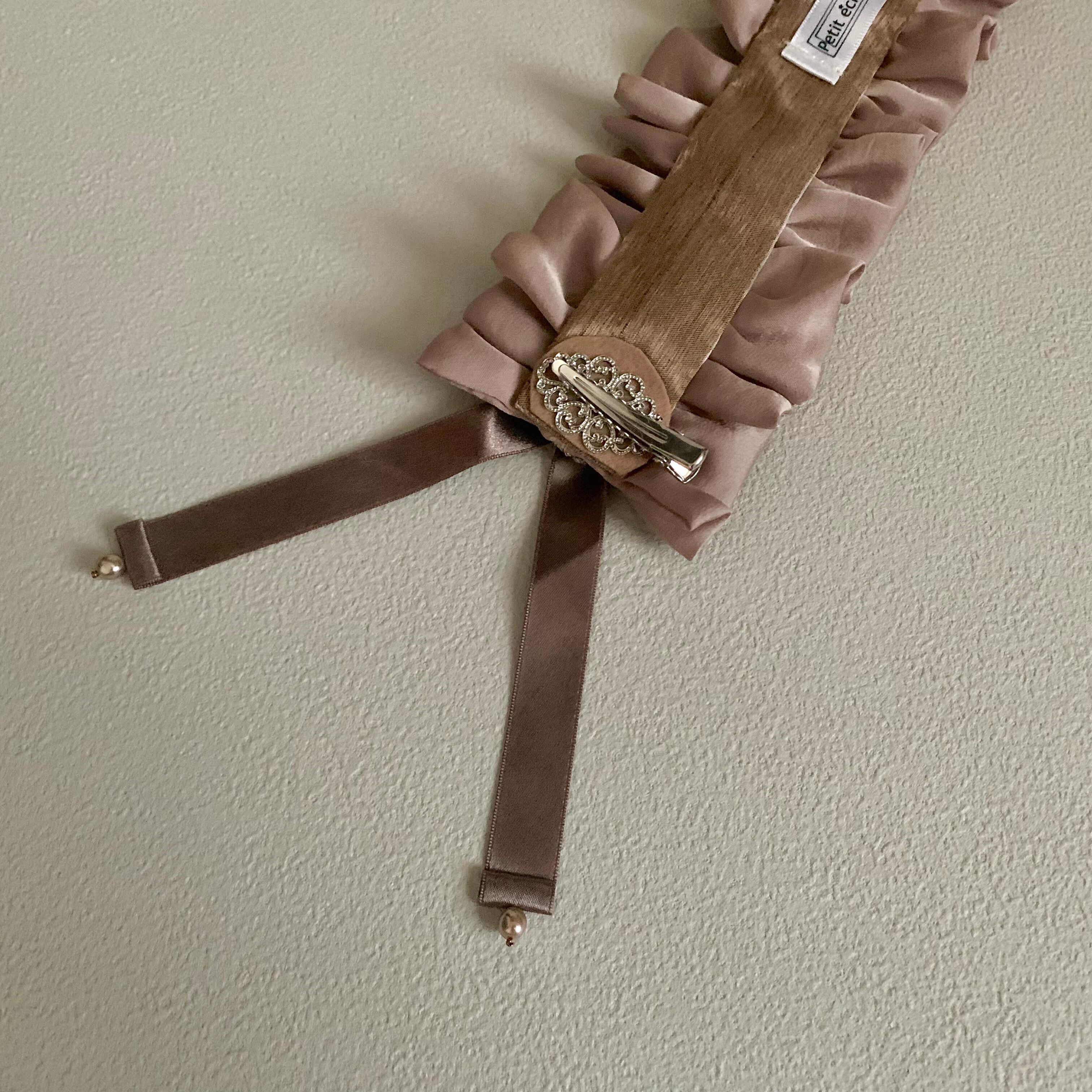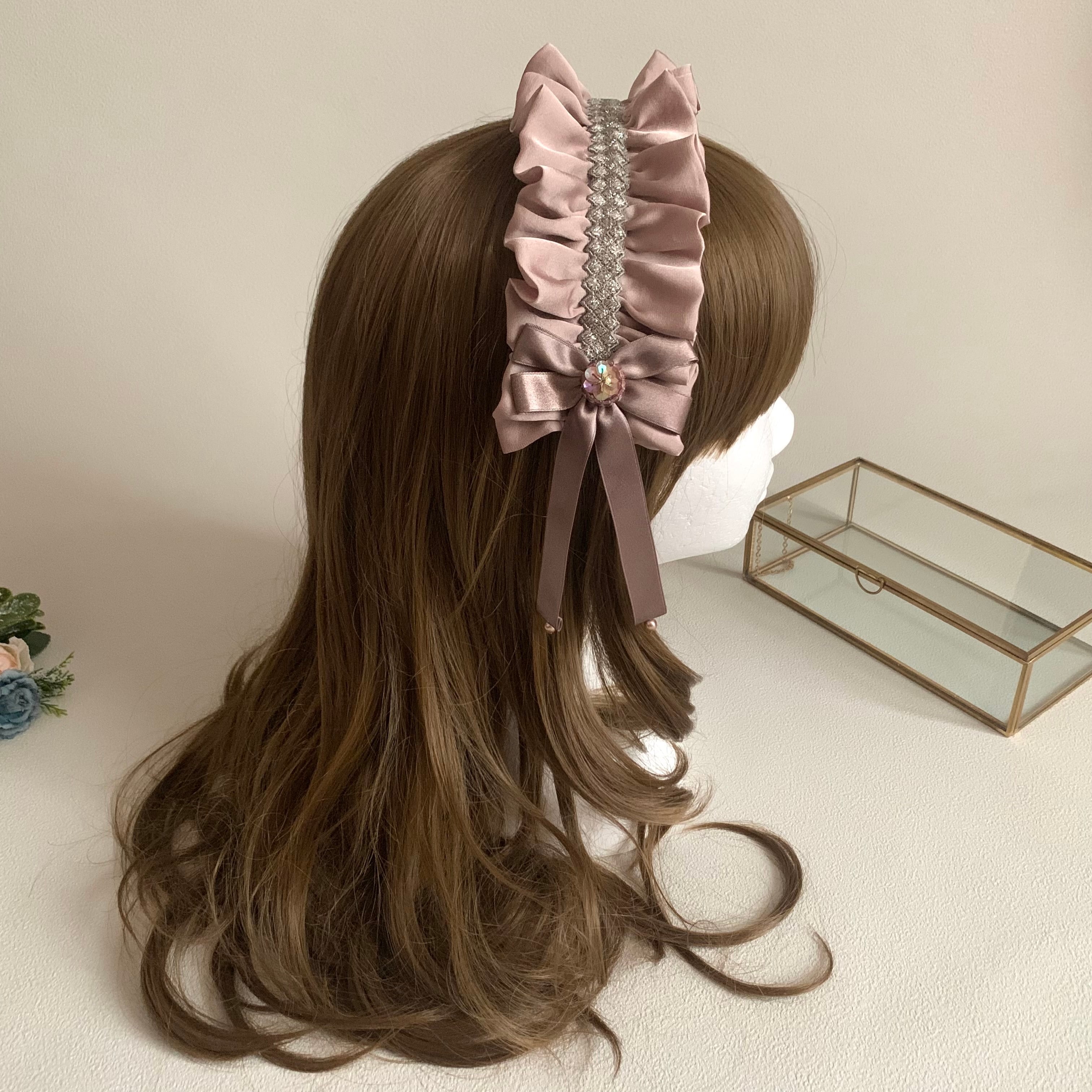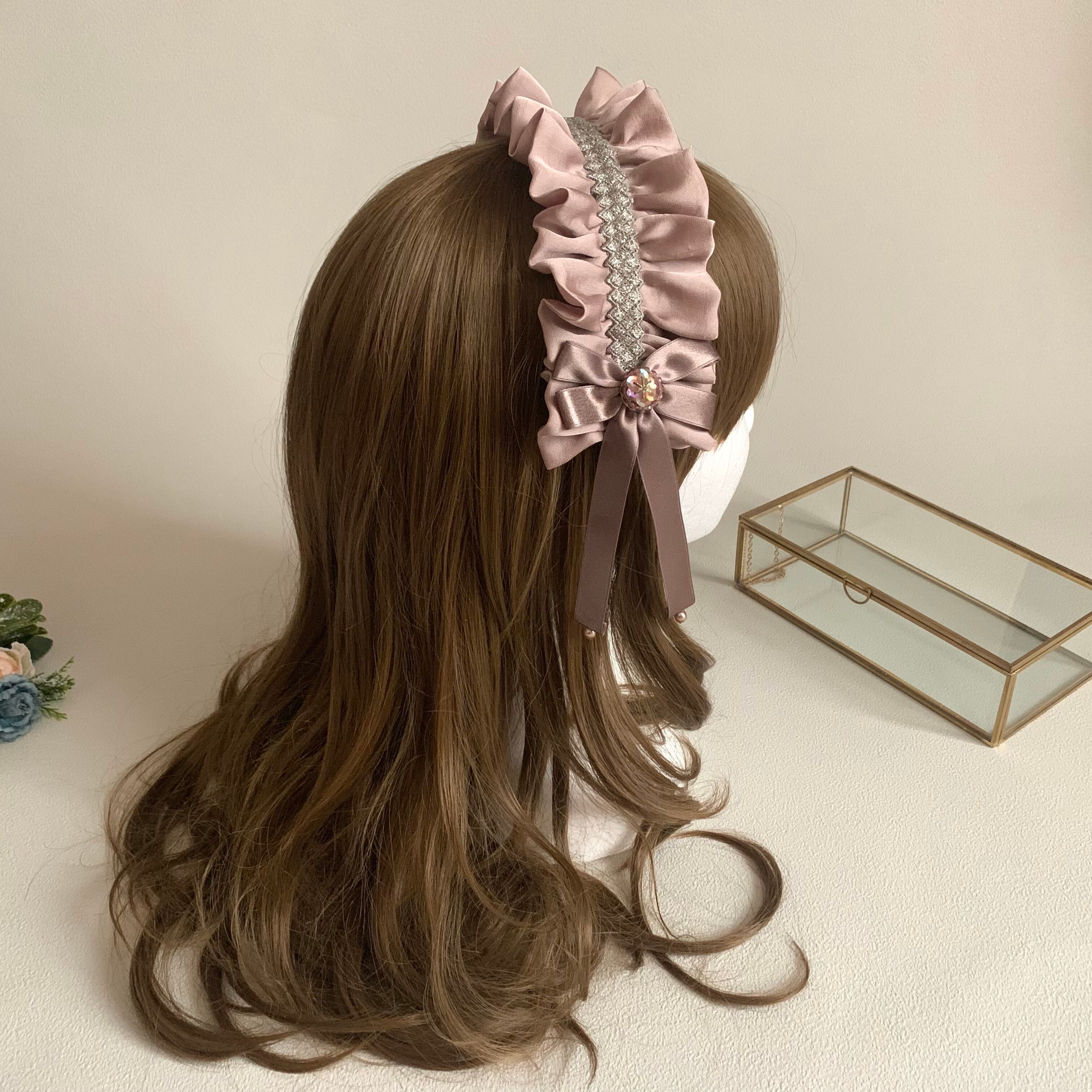 控えめなカラーがコーデに取り入れやすい、フリルとリボンのヘッドドレスです。