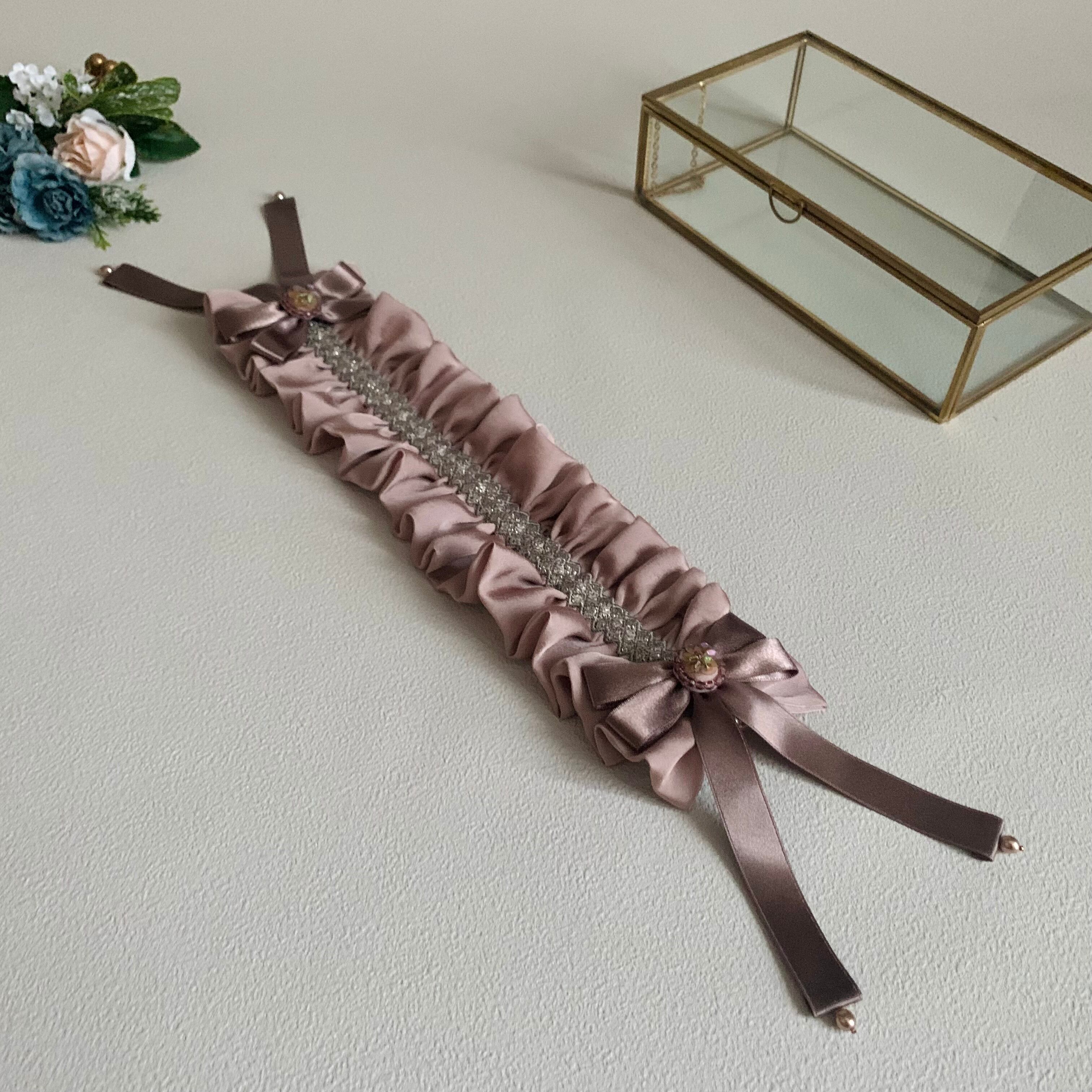 柔らかな手触りのうすいサテンを用いてたっぷりフリルのヘッドドレスを作りました。やさしい色とどこかひんやりとみえる光沢に魅力を感じる生地です。
